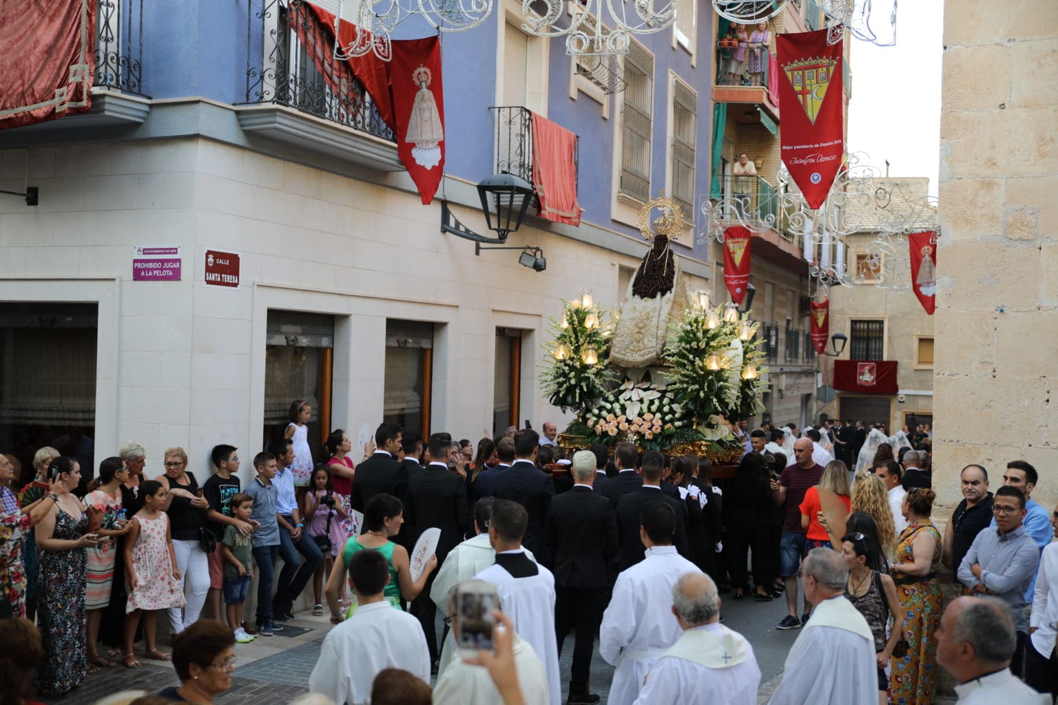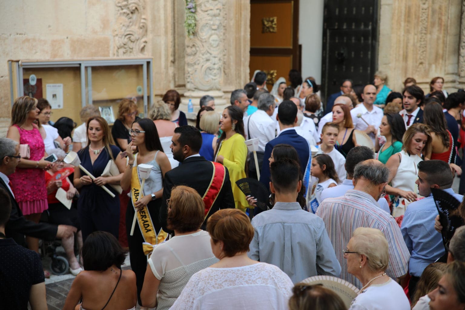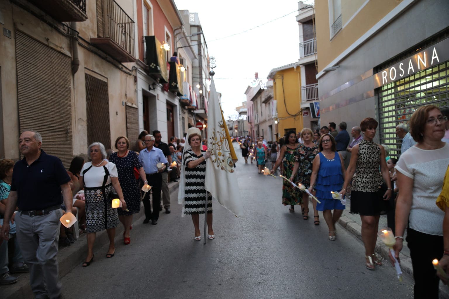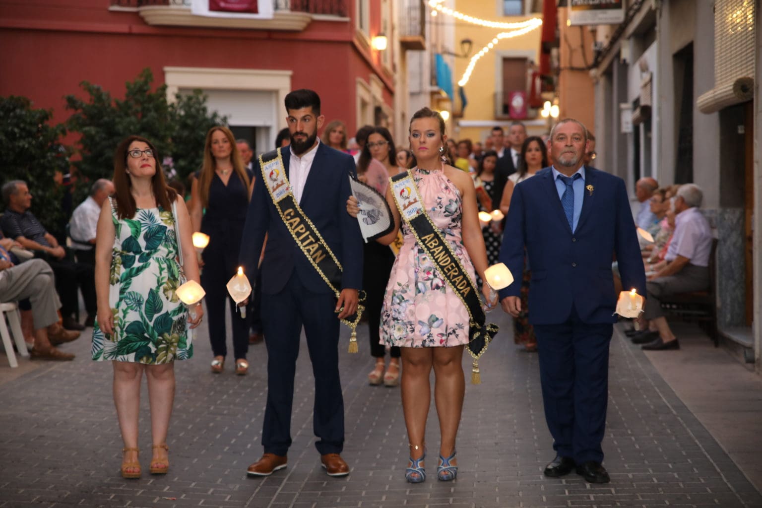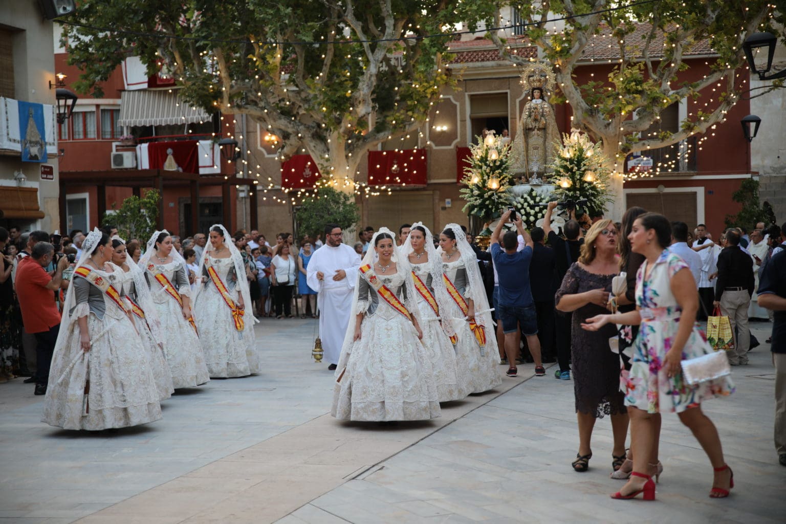 Las campanas de la Basílica de Nuestra Señora del Socorro de Aspe repiqueteaban con regocijo, eran las ocho y la luz del día no quería perderse la salida de la procesión de la patrona del municipio aspense. Los vecinos aprovechando el buen clima esperaban en las calles céntricas que la Virgen llegase hasta ellos para darle sus muestras de cariño. Aspe comparte patrona con el municipio de Hondón de las Nieves y los primeros en salir fueron la agrupación musical de La Serranica. Las Damas de Honor de Aspe y del Hondón de las Nieves, abanderados, festeros y fieles de la patrona acompañaban a la Virgen de las Nieves donde el colorido de los trajes tradicionales y de los porteadores del busto eran la tónica de una procesión que vecinos y curiosos deseaban verla pasar por su casco histórico. Los porteadores del busto, aproximadamente unos cien chicos y chicas que acaban de cumplir los dieciocho años, se turnaban durante el recorrido para llevar sobre sus hombros a su virgen. Las Damas de Honor con su ostentosa indumentaria iban delante de la virgen y detrás de la talla, el clero y autoridades civiles. A las diez de la noche, ante un plaza llena de aspenses y curiosos, se escucharon los cánticos en devoción a la talla de Nuestra Señora de las Nieves en el escenario de la plaza mayor.