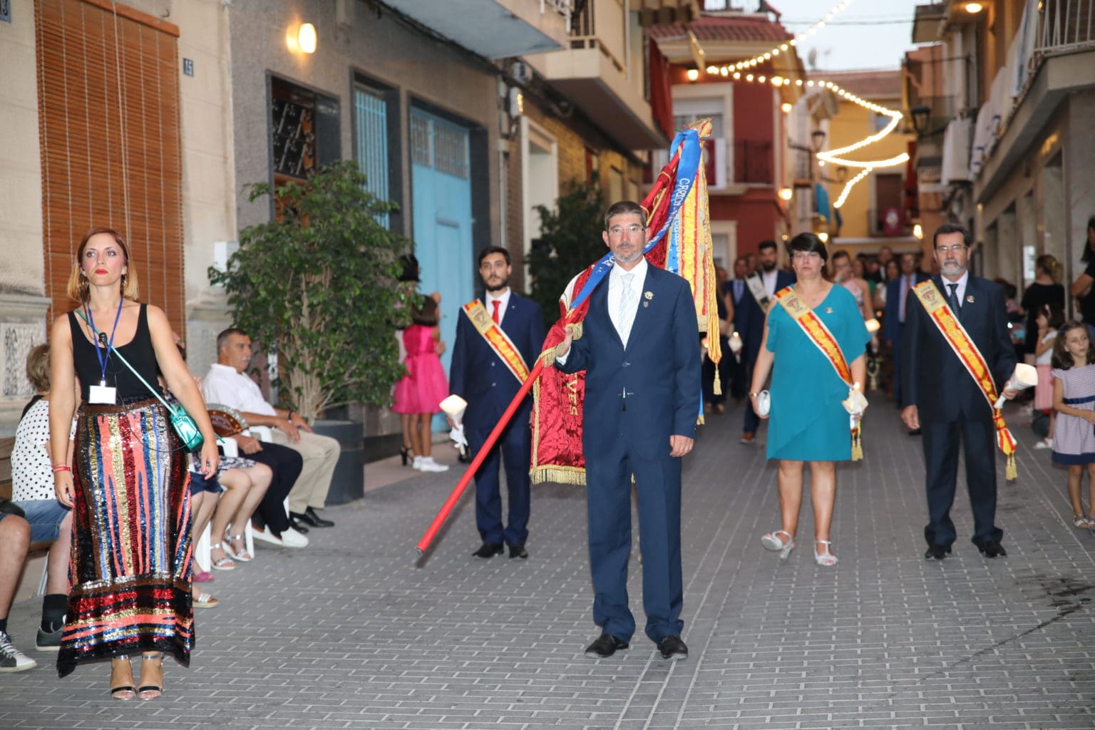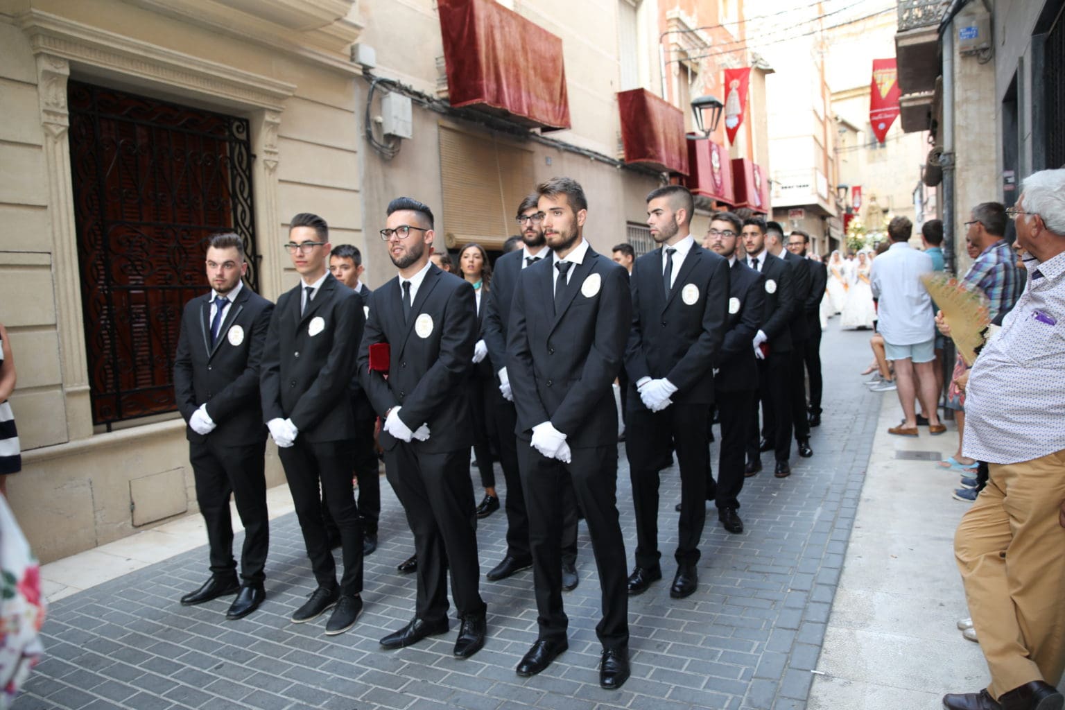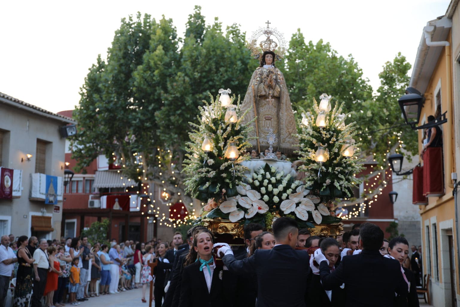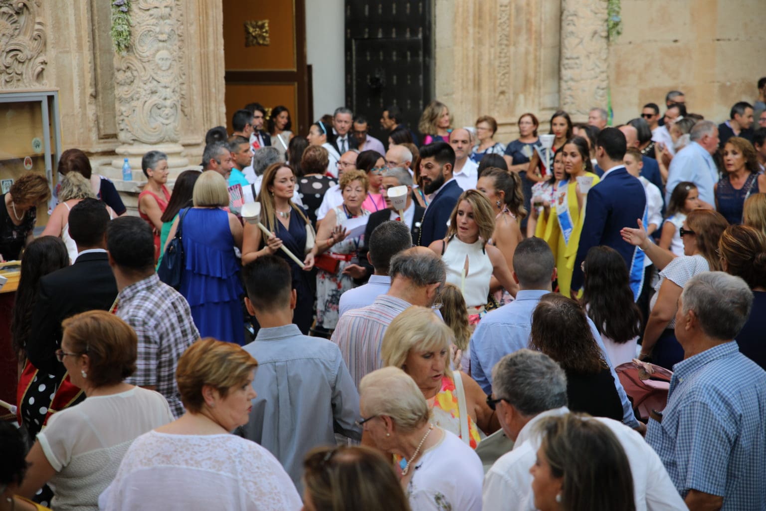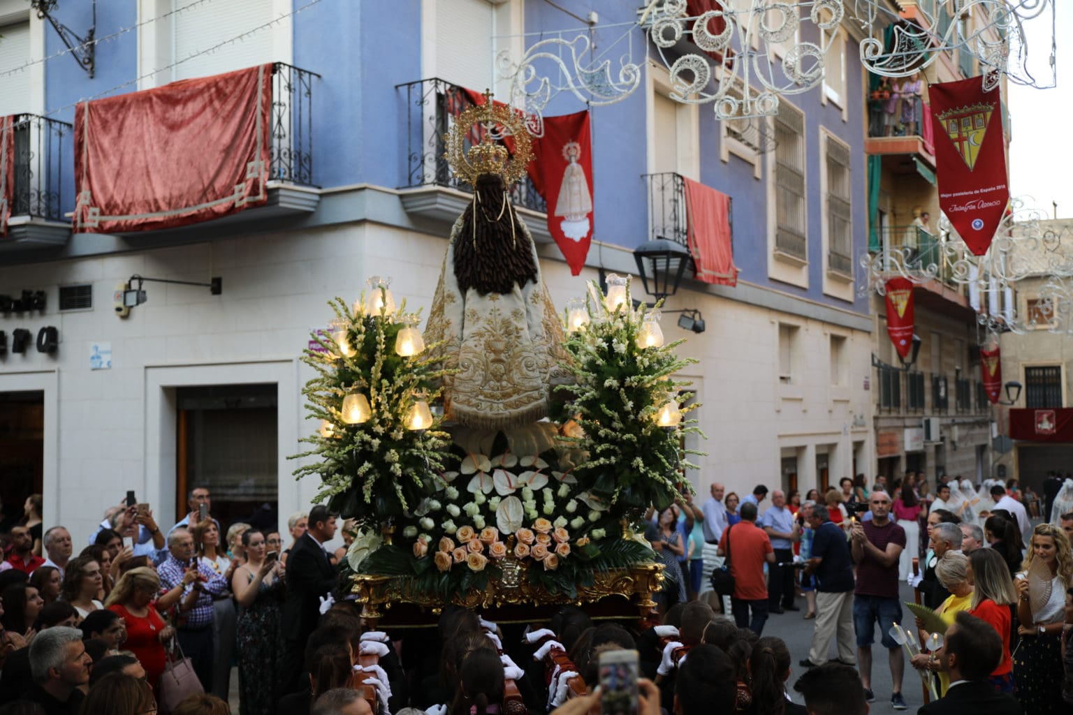 Las campanas de la Basílica de Nuestra Señora del Socorro de Aspe repiqueteaban con regocijo, eran las ocho y la luz del día no quería perderse la salida de la procesión de la patrona del municipio aspense. Los vecinos aprovechando el buen clima esperaban en las calles céntricas que la Virgen llegase hasta ellos para darle sus muestras de cariño. Aspe comparte patrona con el municipio de Hondón de las Nieves y los primeros en salir fueron la agrupación musical de La Serranica. Las Damas de Honor de Aspe y del Hondón de las Nieves, abanderados, festeros y fieles de la patrona acompañaban a la Virgen de las Nieves donde el colorido de los trajes tradicionales y de los porteadores del busto eran la tónica de una procesión que vecinos y curiosos deseaban verla pasar por su casco histórico. Los porteadores del busto, aproximadamente unos cien chicos y chicas que acaban de cumplir los dieciocho años, se turnaban durante el recorrido para llevar sobre sus hombros a su virgen. Las Damas de Honor con su ostentosa indumentaria iban delante de la virgen y detrás de la talla, el clero y autoridades civiles. A las diez de la noche, ante un plaza llena de aspenses y curiosos, se escucharon los cánticos en devoción a la talla de Nuestra Señora de las Nieves en el escenario de la plaza mayor.