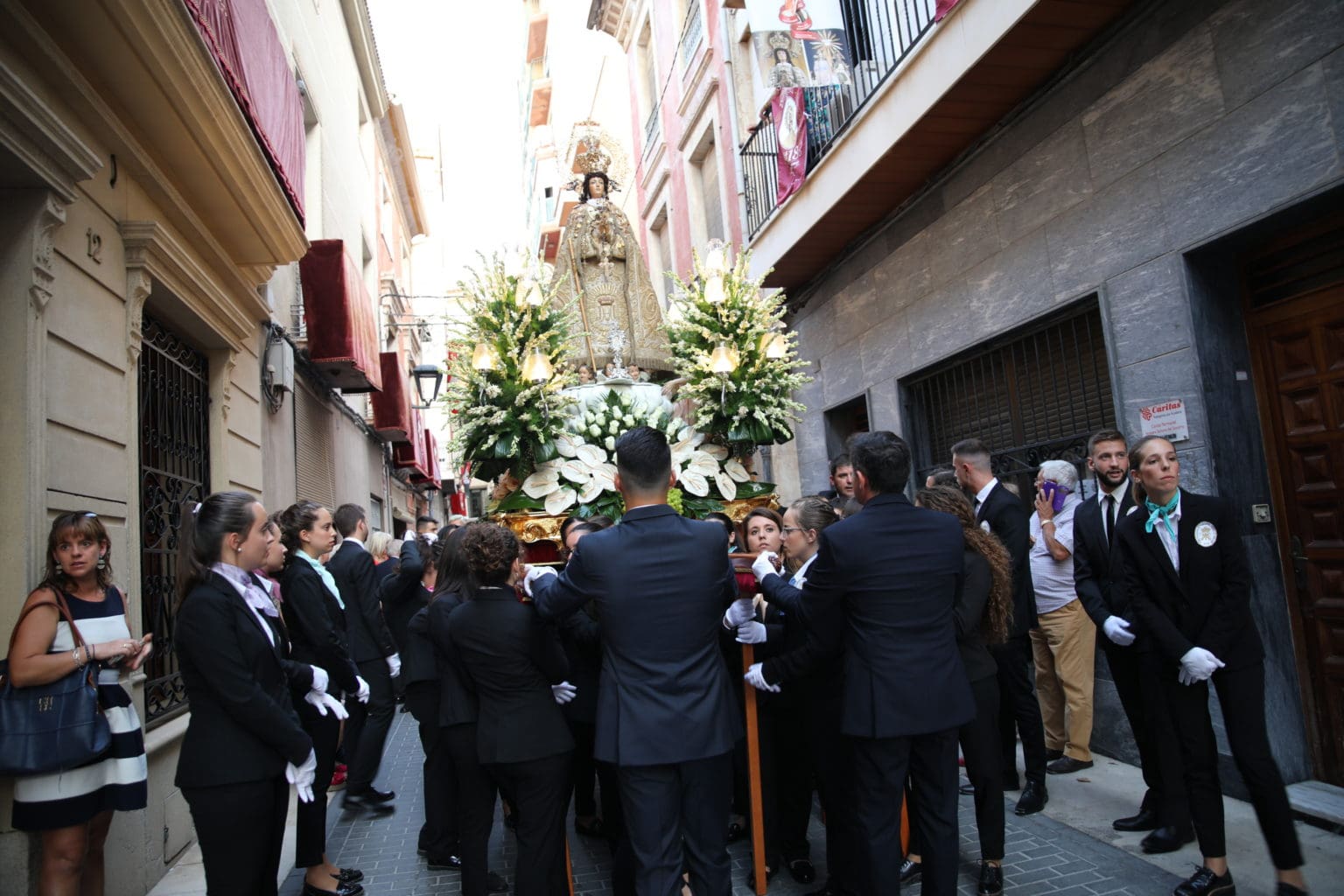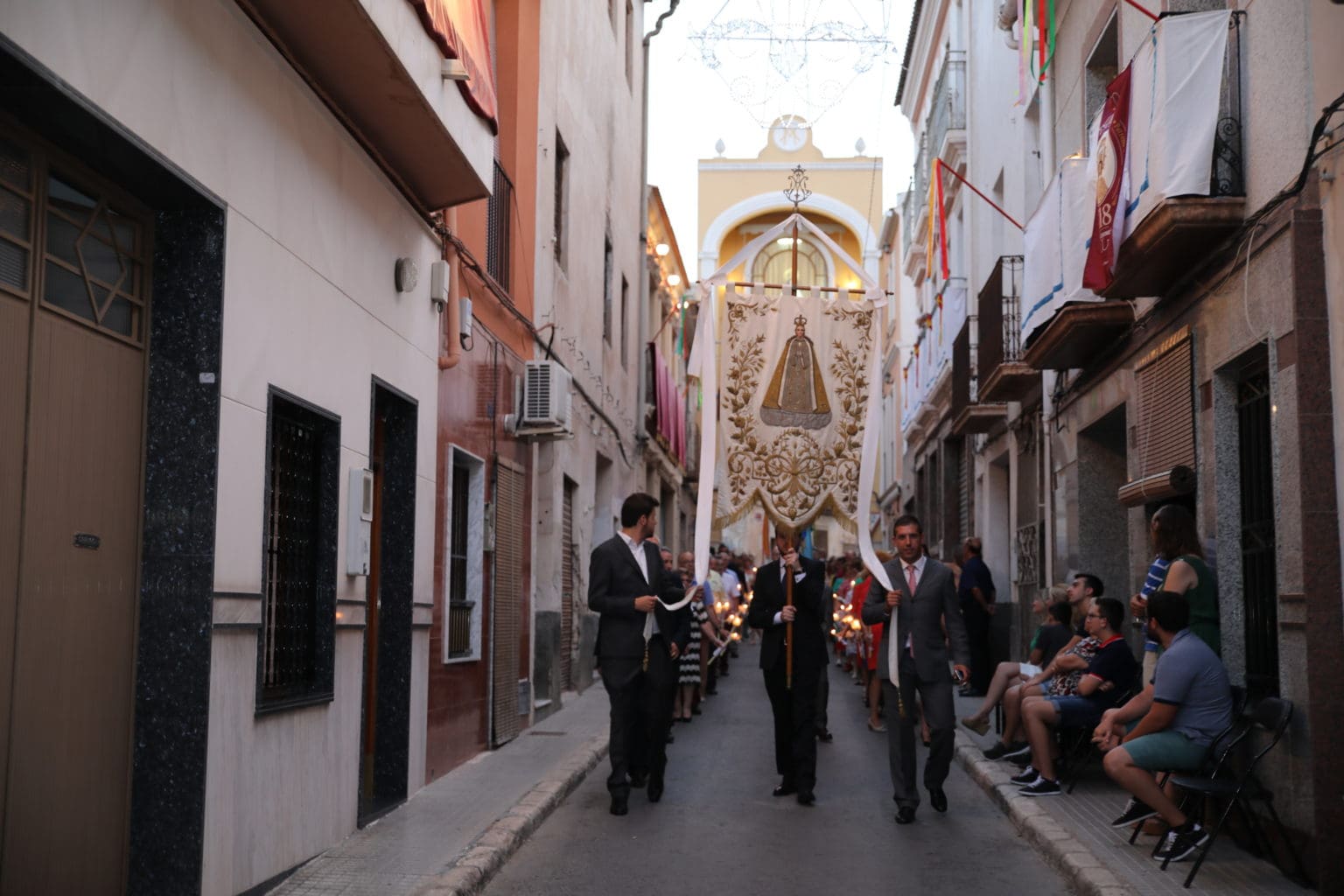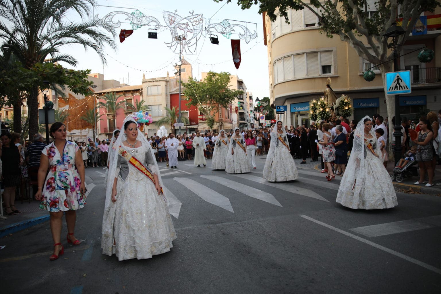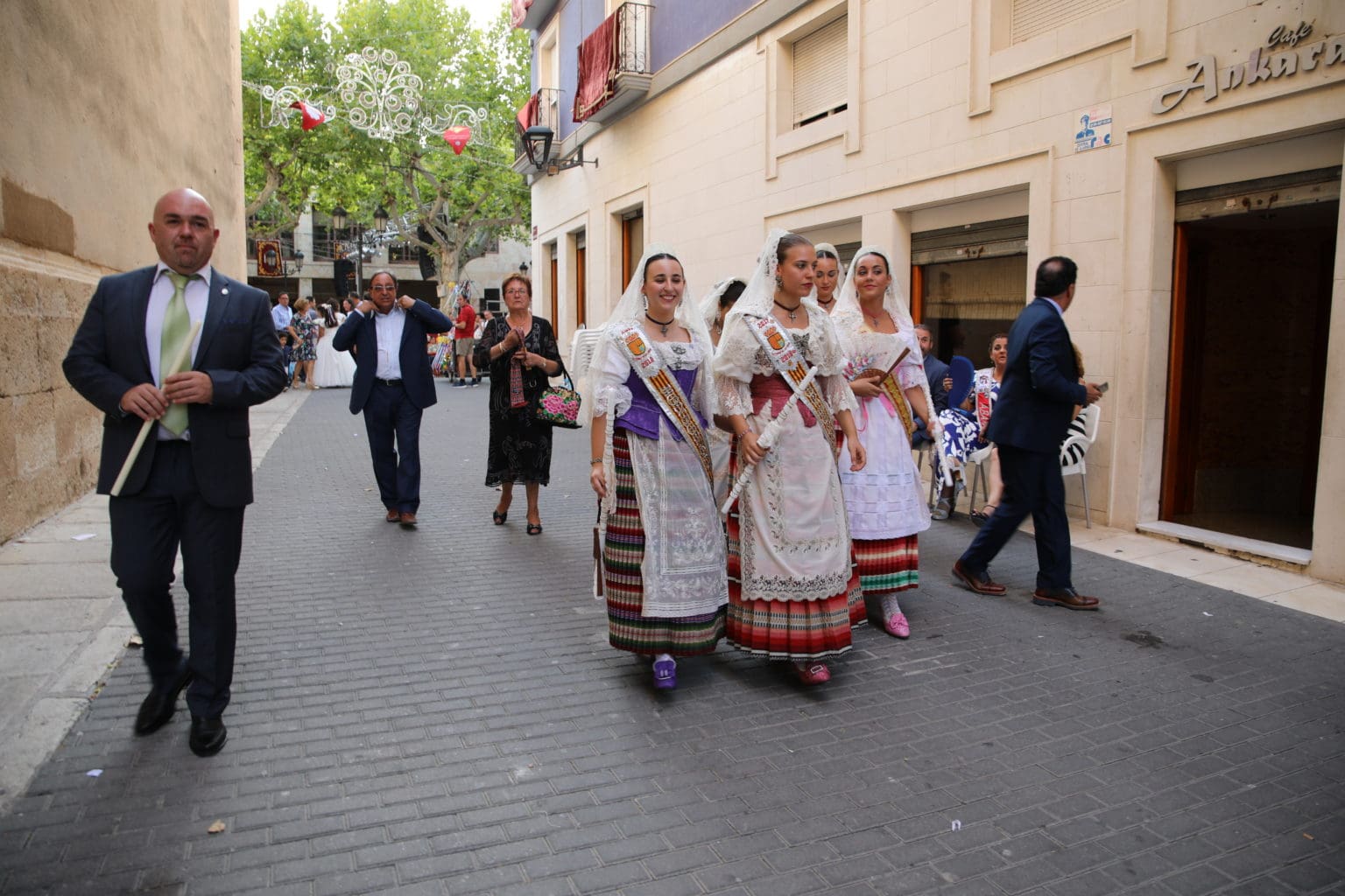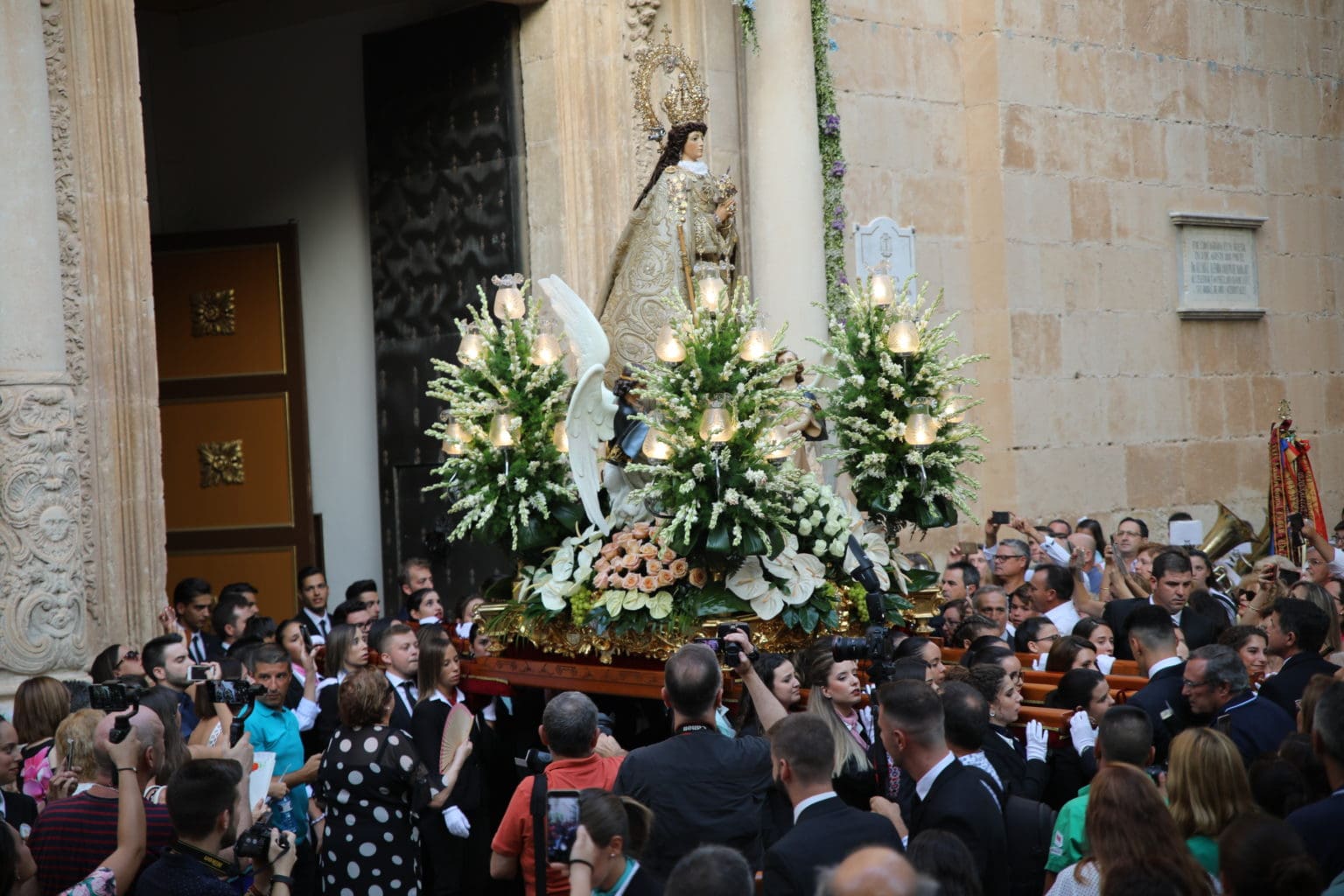 Las campanas de la Basílica de Nuestra Señora del Socorro de Aspe repiqueteaban con regocijo, eran las ocho y la luz del día no quería perderse la salida de la procesión de la patrona del municipio aspense. Los vecinos aprovechando el buen clima esperaban en las calles céntricas que la Virgen llegase hasta ellos para darle sus muestras de cariño. Aspe comparte patrona con el municipio de Hondón de las Nieves y los primeros en salir fueron la agrupación musical de La Serranica. Las Damas de Honor de Aspe y del Hondón de las Nieves, abanderados, festeros y fieles de la patrona acompañaban a la Virgen de las Nieves donde el colorido de los trajes tradicionales y de los porteadores del busto eran la tónica de una procesión que vecinos y curiosos deseaban verla pasar por su casco histórico. Los porteadores del busto, aproximadamente unos cien chicos y chicas que acaban de cumplir los dieciocho años, se turnaban durante el recorrido para llevar sobre sus hombros a su virgen. Las Damas de Honor con su ostentosa indumentaria iban delante de la virgen y detrás de la talla, el clero y autoridades civiles. A las diez de la noche, ante un plaza llena de aspenses y curiosos, se escucharon los cánticos en devoción a la talla de Nuestra Señora de las Nieves en el escenario de la plaza mayor.