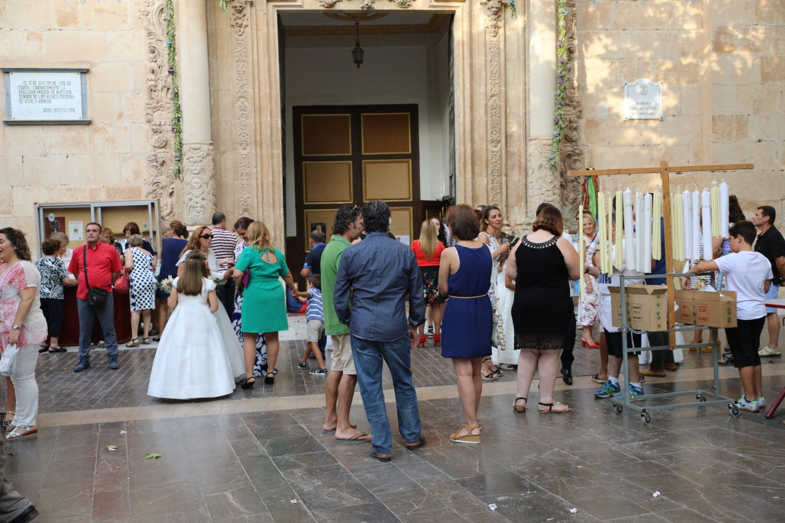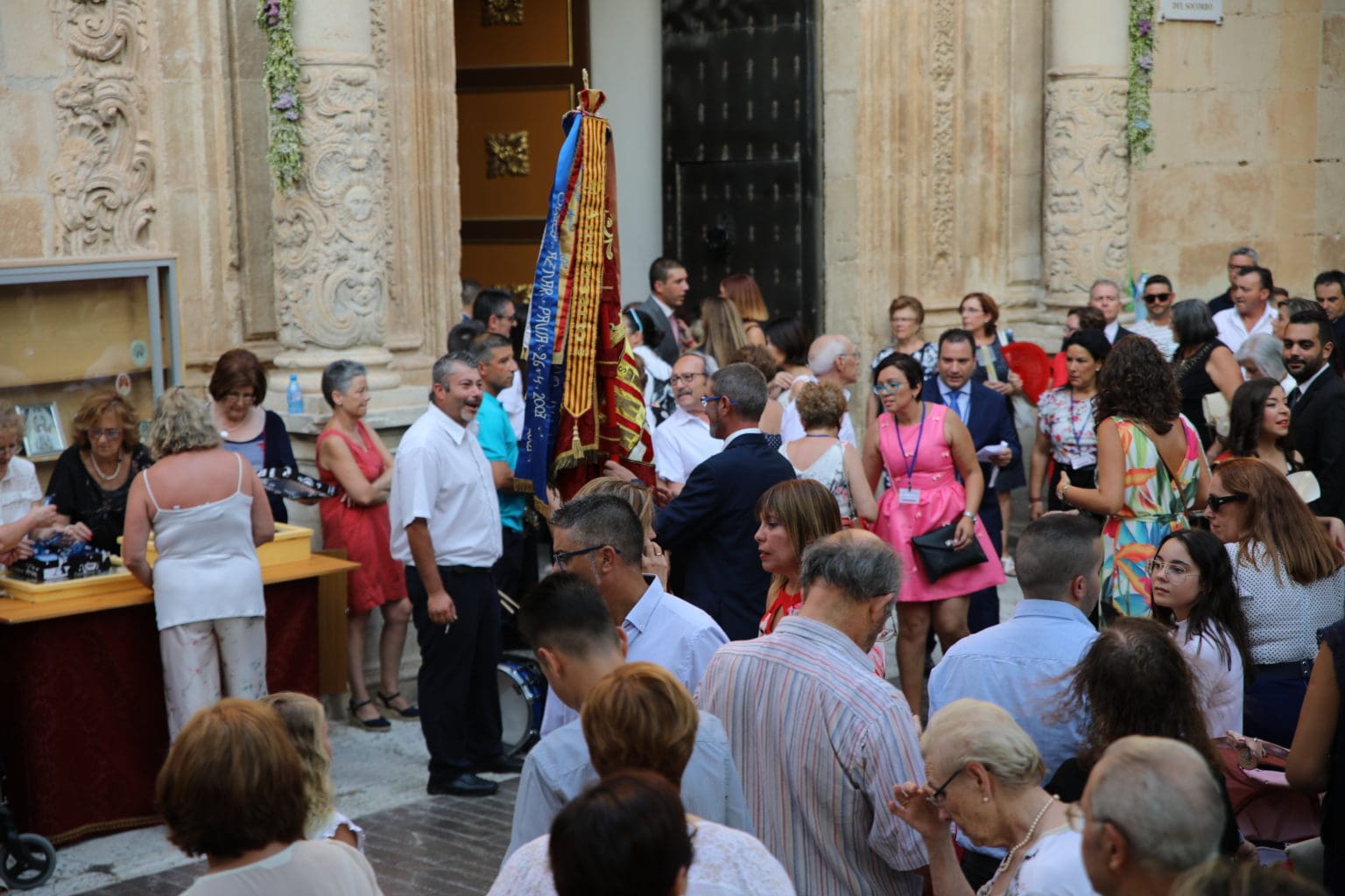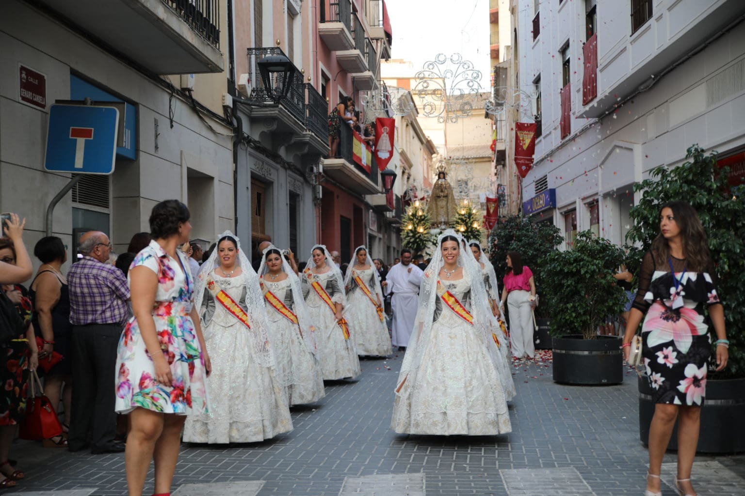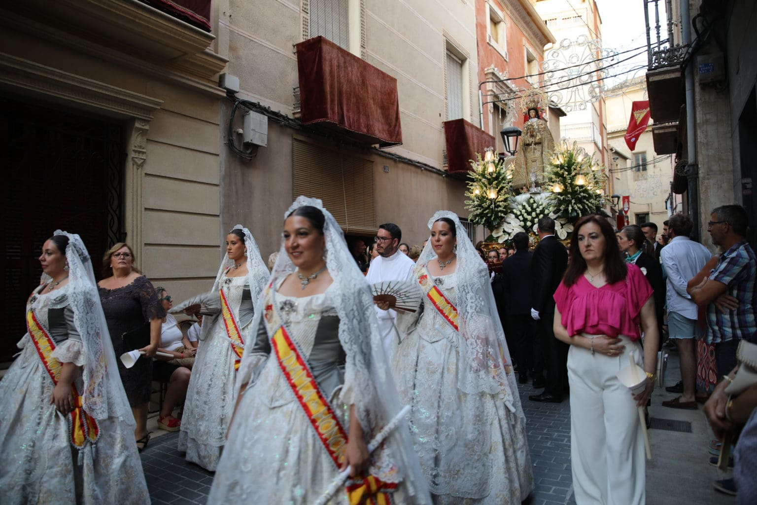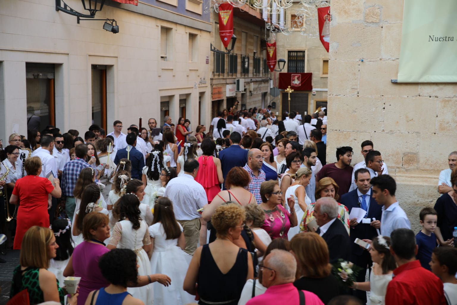 Las campanas de la Basílica de Nuestra Señora del Socorro de Aspe repiqueteaban con regocijo, eran las ocho y la luz del día no quería perderse la salida de la procesión de la patrona del municipio aspense. Los vecinos aprovechando el buen clima esperaban en las calles céntricas que la Virgen llegase hasta ellos para darle sus muestras de cariño. Aspe comparte patrona con el municipio de Hondón de las Nieves y los primeros en salir fueron la agrupación musical de La Serranica. Las Damas de Honor de Aspe y del Hondón de las Nieves, abanderados, festeros y fieles de la patrona acompañaban a la Virgen de las Nieves donde el colorido de los trajes tradicionales y de los porteadores del busto eran la tónica de una procesión que vecinos y curiosos deseaban verla pasar por su casco histórico. Los porteadores del busto, aproximadamente unos cien chicos y chicas que acaban de cumplir los dieciocho años, se turnaban durante el recorrido para llevar sobre sus hombros a su virgen. Las Damas de Honor con su ostentosa indumentaria iban delante de la virgen y detrás de la talla, el clero y autoridades civiles. A las diez de la noche, ante un plaza llena de aspenses y curiosos, se escucharon los cánticos en devoción a la talla de Nuestra Señora de las Nieves en el escenario de la plaza mayor.