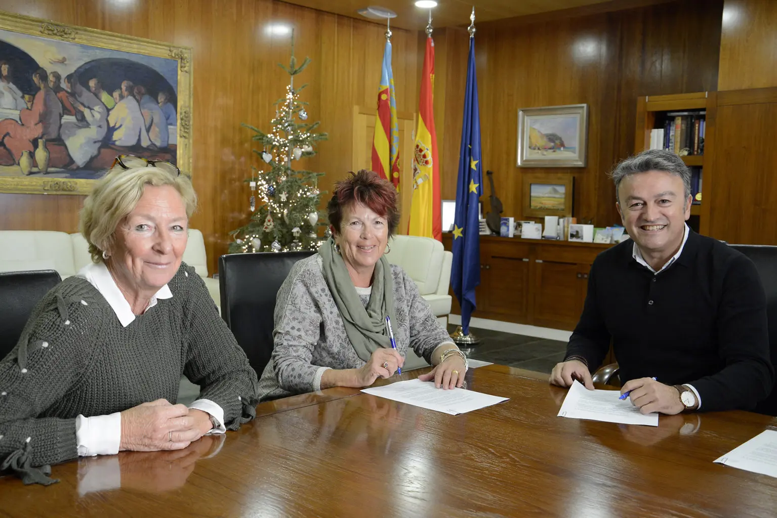 El alcalde, José Chulvi, y la presidenta de la protectora, Mandy Conway han rubricado un acuerdo en presencia de la concejala de Medio Ambiente, Doris Courcelles.