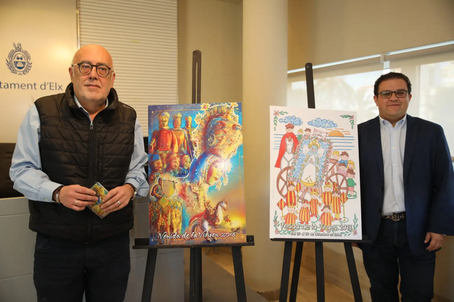 El presidente de la Sociedad Venida de la Virgen, José Manuel Sabuco Más, acompañado del concejal de Fiestas de Elche, José Pérez han presentado la programación de las fiestas de la Venida de la Virgen junto a los carteles ganadores de los certámenes institucional e infantil, realizados por Vicente Javier Poveda el primero e Isabel Marín Legidos el segundo. La Sala de Ámbito Cultural del Centro Comercial El Corte Inglés Ciudad de Elche acogerá la exposición de los 709 dibujos que han participado en este certamen, realizados por chavales de 16 colegios, y sólo se podrán ver hasta el lunes 17 de diciembre.