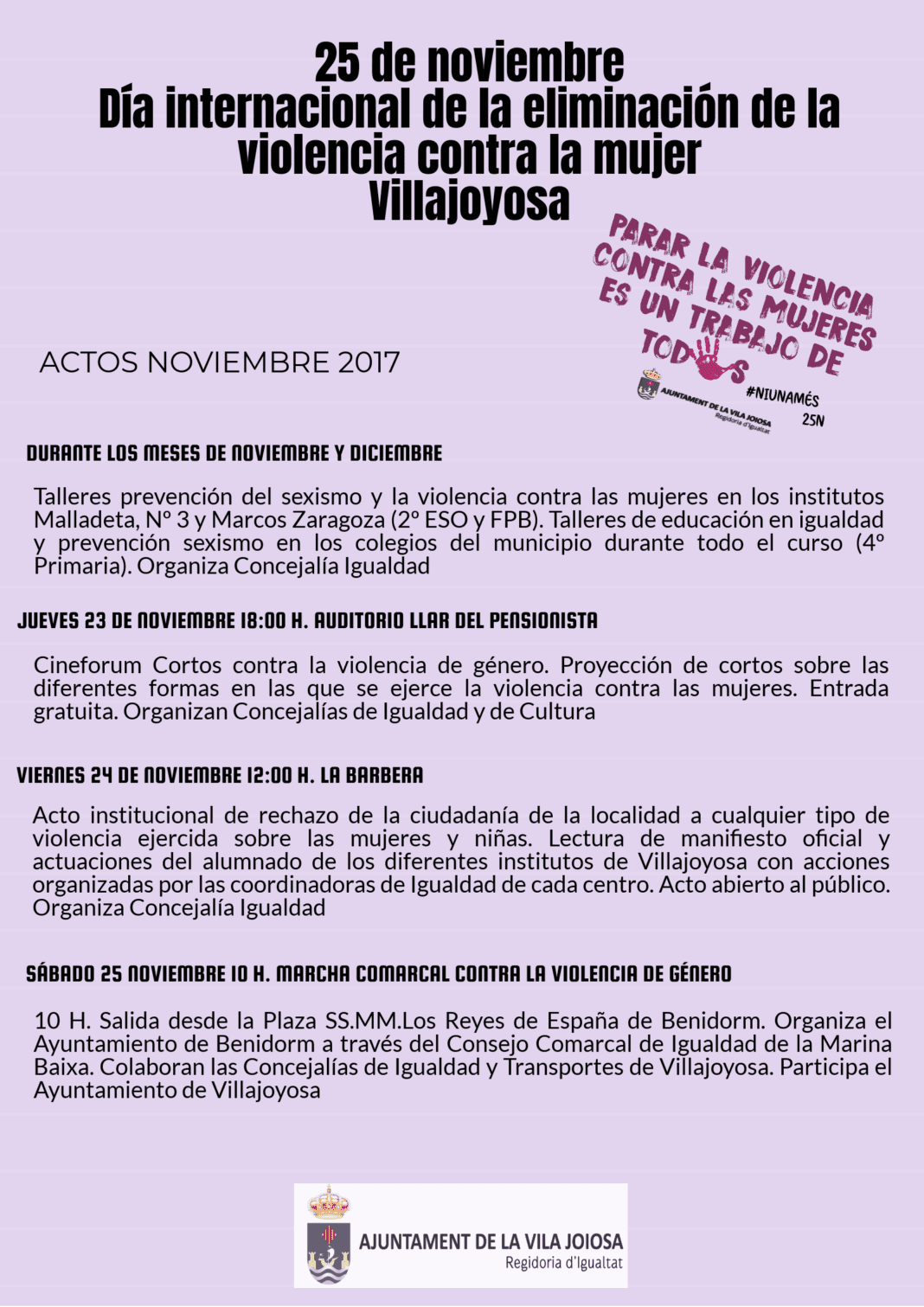 El Día internacional de la eliminación de la violencia contra la mujer, 25 de noviembre, se celebrará la Marcha Comarcal contra la Violencia de Género en Benidorm organizado por el Consejo Comarcal de Igualdad y que impulsa la Asociación Mujeres con Voz.