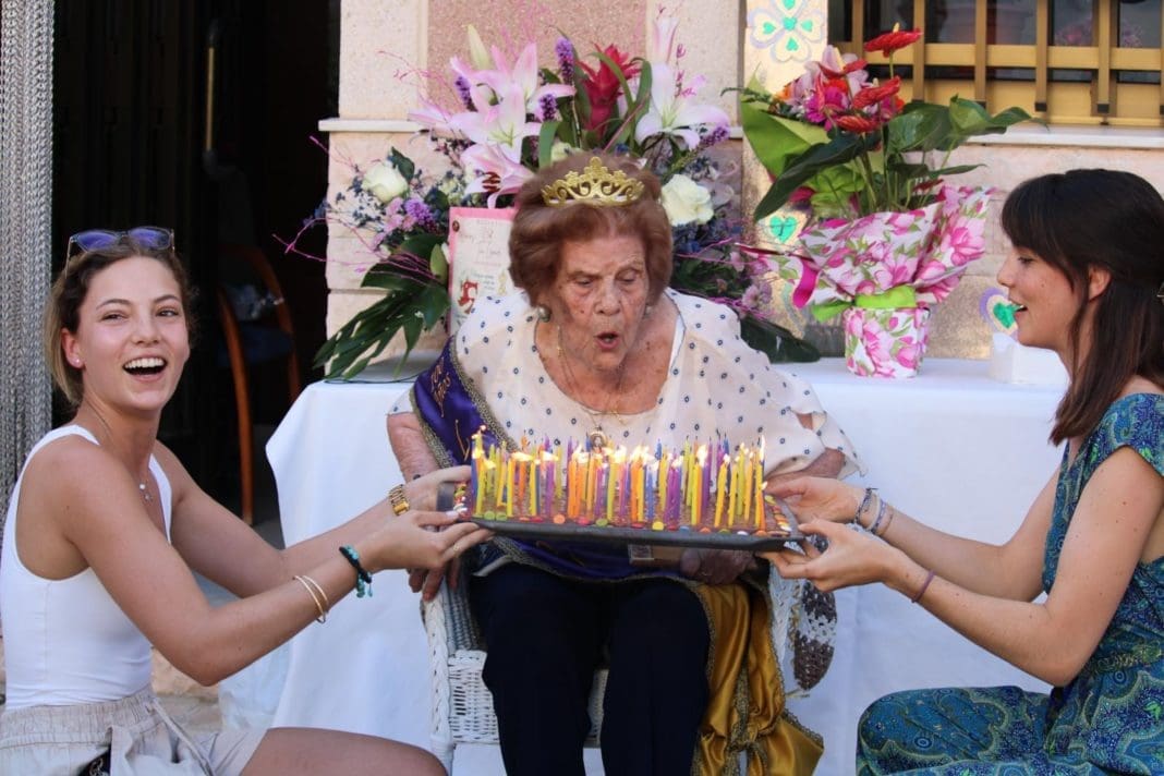 Para su sorpresa, a media tarde salió de casa y se encontró con una fiesta que le habían organizado familiares, vecinos y amigos, con tarta casera incluida (y 100 velas que sopló y apagó a golpe de abanico), guirnaldas decorativas, aperitivo para todo el que se acercara a felicitarla, un rótulo que anunciaba el evento, y flores, muchas flores y macetas, por las que siente verdadera pasión.