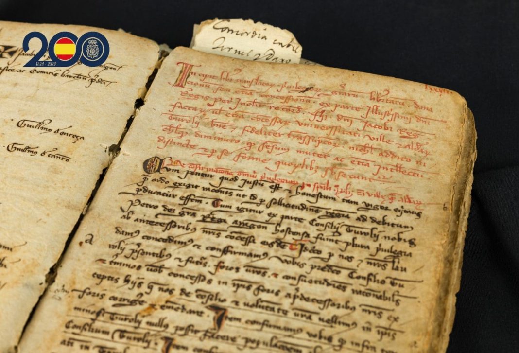 La Policía Nacional y la Dirección General de Patrimonio Cultural de la Región de Murcia, han celebrado un acto para hacer entrega a representantes del Gobierno de Aragón, de un importante códice manuscrito del Rey Don Jaime de Aragón del siglo XIV, con un alto valor histórico y que fue recuperado e intervenido el pasado año por agentes especializados en patrimonio histórico y cultural de la Jefatura Superior de Policía de la Región de Murcia.