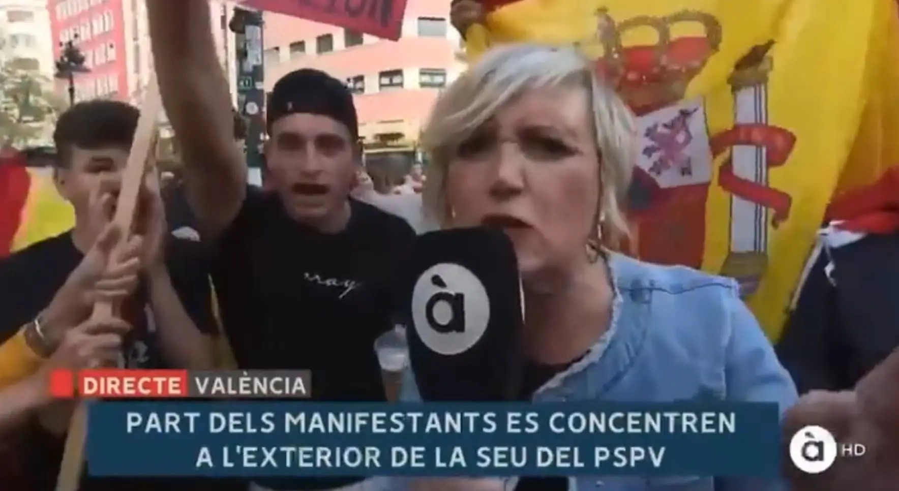 Durante los informativos del mediodía, la reportera de À Punt, Matilde Alcaraz, estaba cubriendo las concentraciones frente a la sede del PSPV en València convocadas por VOX cuando ha empezado a ser increpada por los manifestantes, los cuáles han llegado a lanzarle diversas latas.