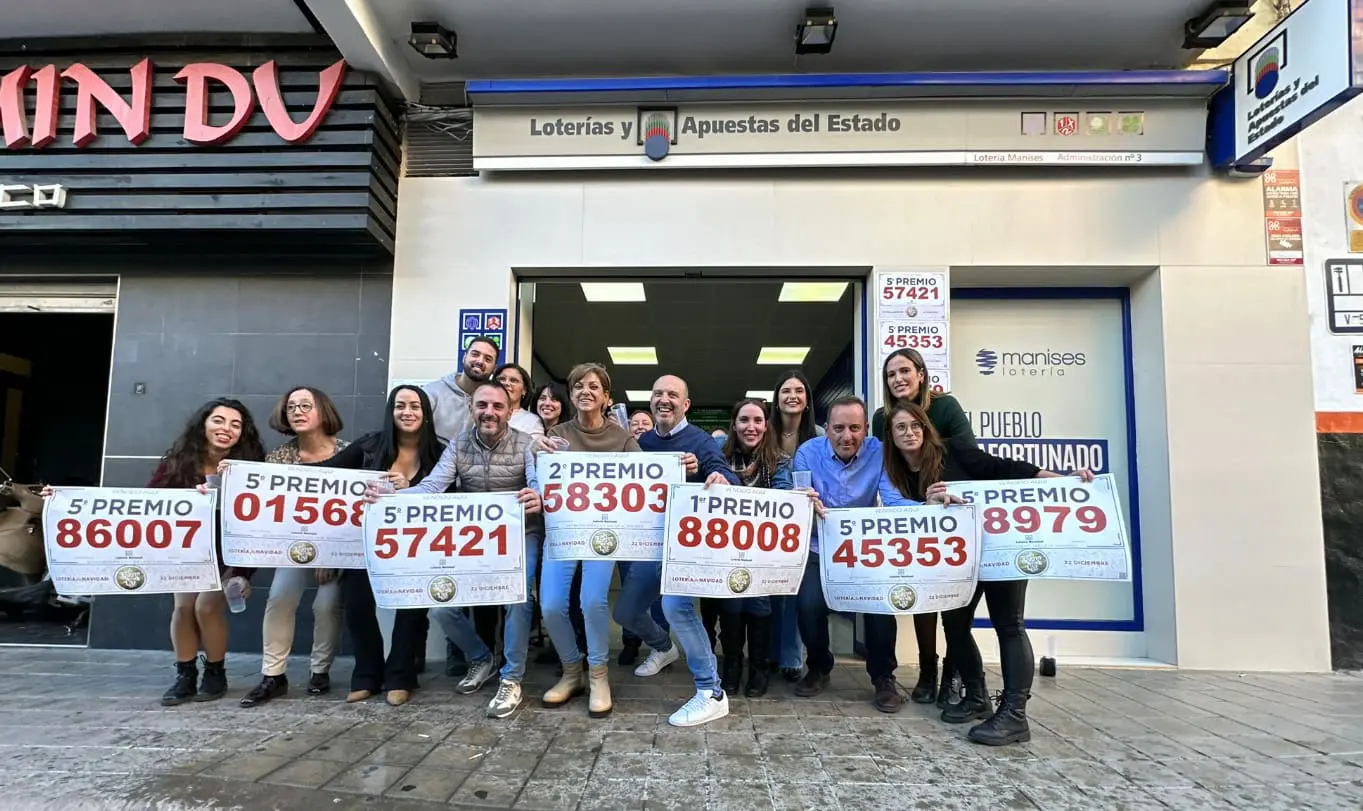 Tampoco hay que olvidarse de Manises, la estrella de todos los años. Concretamente, la administración número 3, ubicada en la calle Maestro Guillem número 5, que ha batido todos los récords y ha repartido siete premios en este sorteo, el Gordo, el segundo y cinco quintos premios.