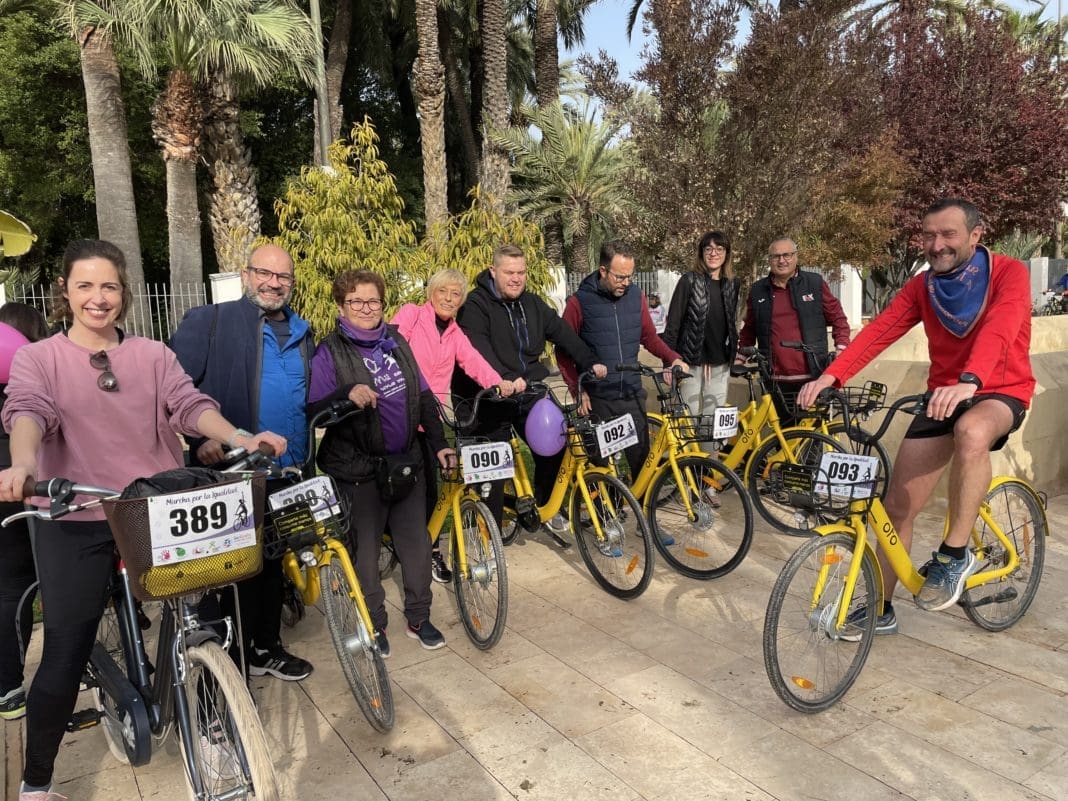 El alcalde de Elche, Carlos González, y los ediles Héctor Díez, Esther Díez, Vicente Alberola, Mariano Valera, Patricia Macià, Felip Sànchez y Puri Vives se han sumado esta mañana a la ‘I Marcha en Bici por la Igualdad’ organizada por la Unión Ciclista de Elche y por la Coordinadora Feminista, una fiesta del deporte para reivindicar la igualdad real en la sociedad entre hombres y mujeres.
