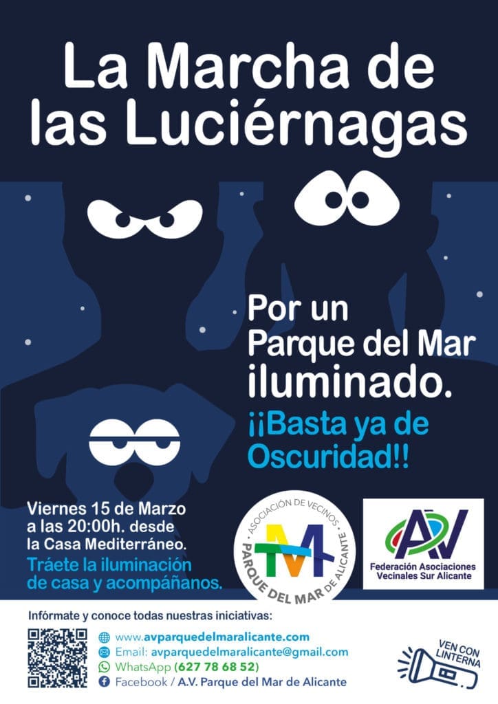 Tras la desconvocatoria del pasado 23 de febrero en señal de duelo y respeto por el trágico incendio de Valencia, la Asociación de Vecinos Parque del Mar y la Federación de Asociaciones Vecinales del Sur de Alicante vuelven a convocar “La Marcha de las Luciérnagas” para mañana viernes 15 de marzo a las 20:00 h en el acceso al parque junto a Casa Mediterráneo.