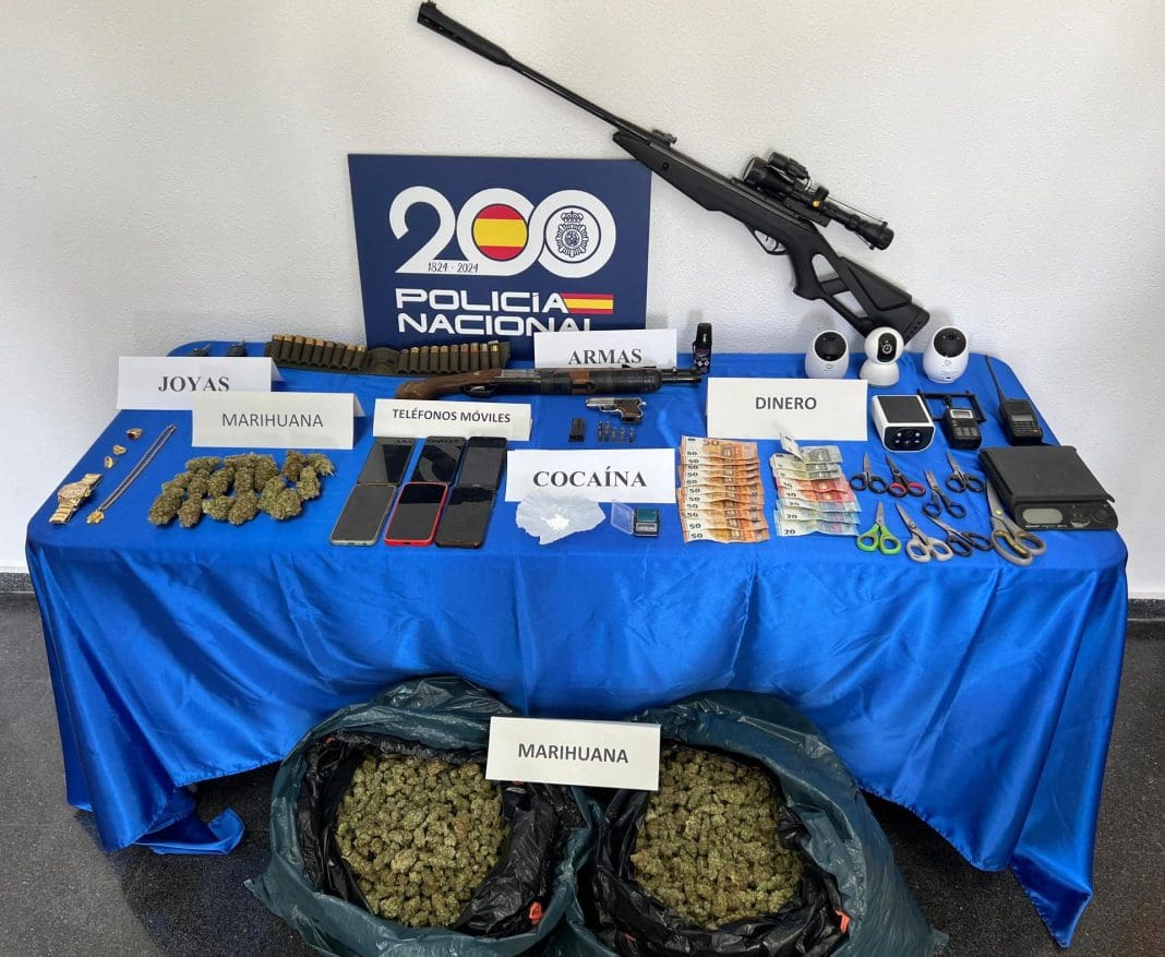 También se intervinieron 9 kilogramos de cogollos de marihuana en fase de secado, una carabina de aire comprimido, distintas dosis de cocaína, teléfonos móviles, joyas y más de 600 euros en metálico procedentes presuntamente de la venta de sustancias.