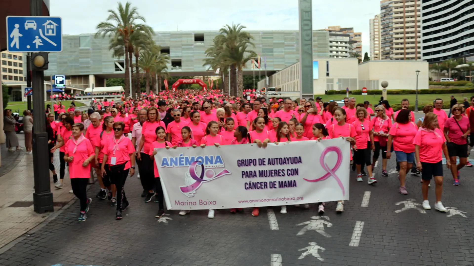 Alrededor de 6.000 personas han participado este domingo en una nueva edición de la Marcha Solidaria organizada por el Grupo de Autoayuda para Mujeres con Cáncer de Mama y Ginecológico, Anémona Marina Baixa, que ha recorrido la distancia de unos 4,5 kilómetros que enlaza el Casco Antiguo y el Paseo Marítimo de Poniente y el de Tamarindos, teniendo como punto de partida y destino el Ayuntamiento de Benidorm. El alcalde de la ciudad, Toni Pérez, ha encabezado la marcha junto a la presidenta de Anémona, María Botella; la edil de Igualdad, Ángela Zaragozí, además de otros miembros de la Corporación Municipal; las reinas de las Fiestas Mayores Patronales, Angélica Morenilla Such y Daniela Talavera Ventura, junto a sus cortes de honor; y muchísimo público que ha participado o ha arropado a esta “marea rosa” a su paso por las calles de la ciudad.