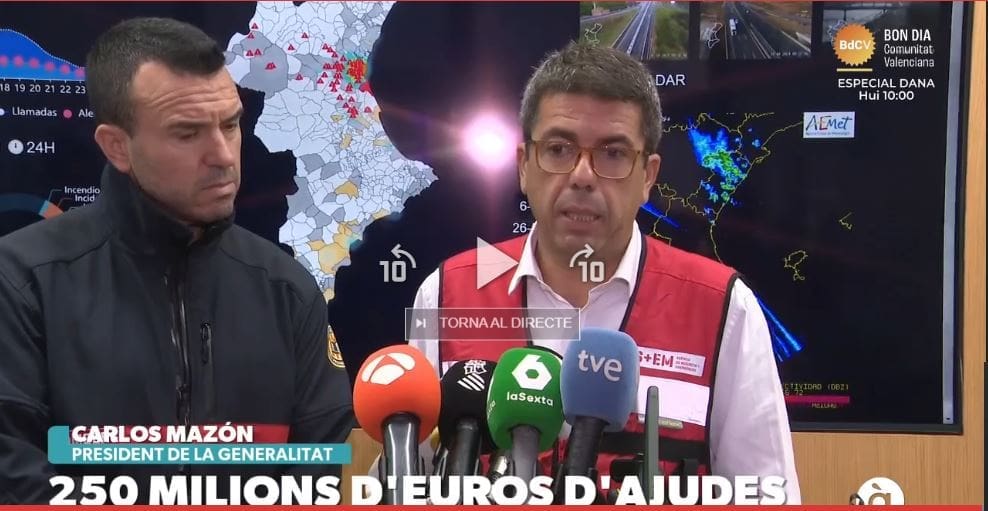 «Ayudas exprés rápidas y sin papeleos» con «un mínimo de 6000 euros por afectado» ampliable y compatible con cualquier otra ayuda. Este es primer mensaje que ha ofrecido en President de la Generalitat, Carlos Mazón en su comparecencia pública.