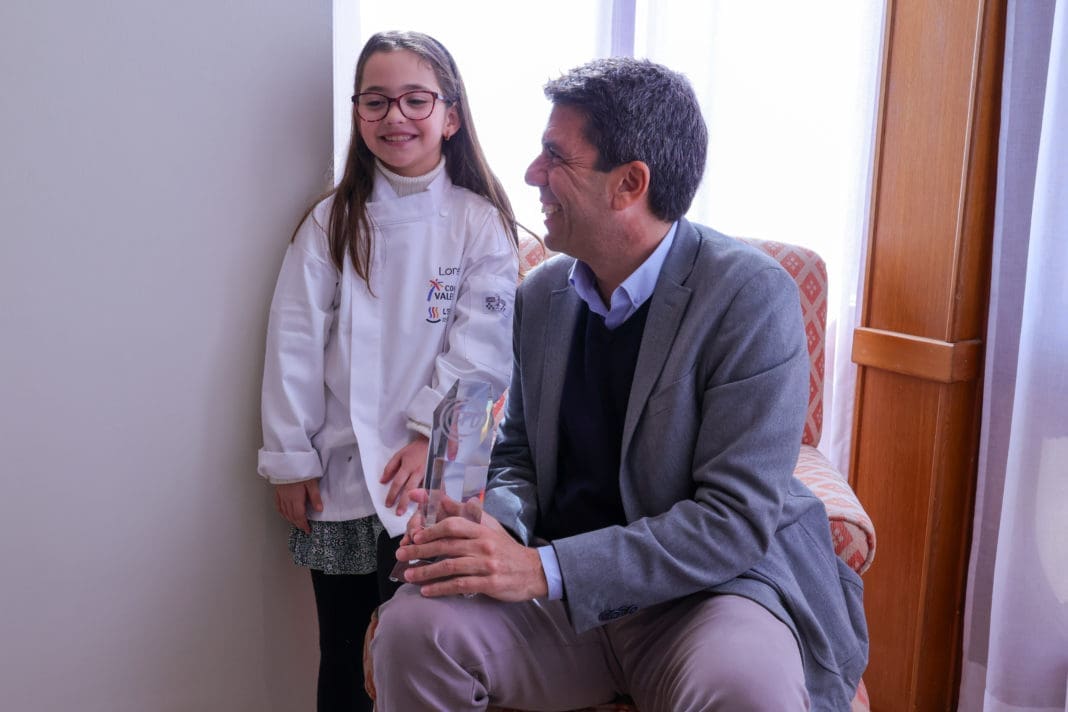 El president de la Generalitat, Carlos Mazón, junto con la consellera de Innovación, Industria, Comercio y Turismo, Nuria Montes, ha recibido a la ganadora de ‘MasterChef Junior 10’, Loreto Riera, que con tan solo ocho años se ha convertido en la vencedora más joven de todas las ediciones del programa.