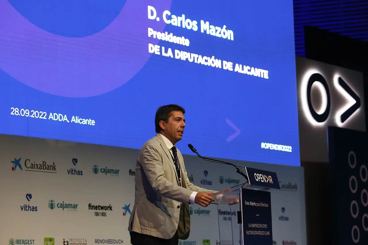 El presidente de la Diputación de Alicante, Carlos Mazón, ha inaugurado esta mañana en el ADDA el foro de directivos Opendir, donde ha puesto en valor las fortalezas de la provincia de Alicante para superar la crisis económica actual, resaltando, entre ellas, la apuesta de su tejido productivo y de sus instituciones por el talento y la digitalización.