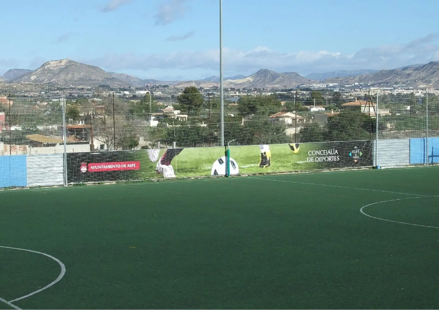 Como principal novedad, en la valla también se ha colocado una gran lona resistente al agua y al sol, que ayudará a reducir posibles lesiones por abrasiones o quemaduras, a la vez que se mejora sensiblemente el impacto visual de la chapa metálica existente, al quedar recubierta con esta ingeniosa funda microperforada y serigrafiada con imágenes de fútbol y corporativas del Ayuntamiento de Aspe.