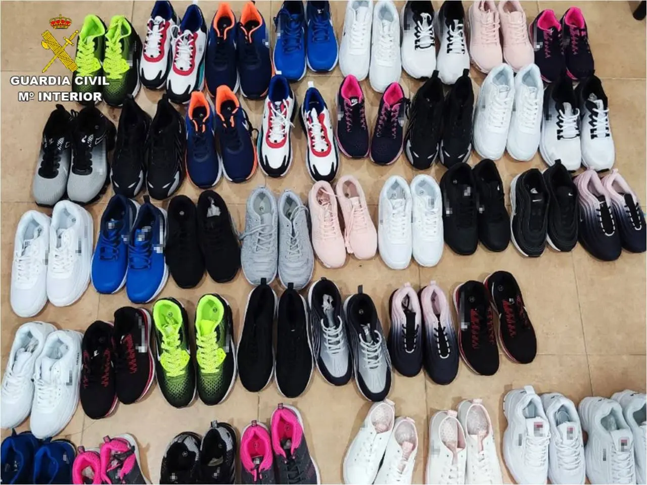 Realizadas las pertinentes comprobaciones, los agentes constataron la sospecha, interviniendo una gran cantidad de artículos: 375 camisetas con el estampado de diferentes marcas; 21 pantalones cortos; 240 pantalones deportivos; 249 conjuntos de prendas de ropa interior; 18 pañuelos; 64 sudaderas; 257 gorras; 659 pares de zapatillas; 106 equipaciones de fútbol; 793 bolsos; 39 bandoleras; 54 monederos; 193 gafas de sol; 362 relojes; además de 361 prendas sin serigrafiar; 43 papeles para realizar el estampado de diferentes marcas (35 de ellos, sin haber sido aún utilizados y 8 que habían sido ya estampados); una máquina plancha para realizar el estampado in situ; varios distintivos metálicos con el nombre de primeras firmas, así como los útiles para engarzarlos en artículos tipo bolsos, monederos, etcétera.
