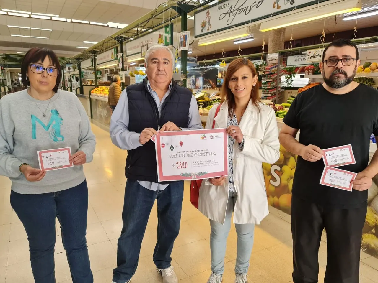 Los comercios asociados a la Asociación de Comerciantes del Mercado Central de Elda sortearán cerca de 2.000 euros en vales de compra para la Navidad. Así lo ha anunciado la concejala de Comercio y Mercados, Silvia Ibáñez, y el vicepresidente de la Asociación, Francisco Vico, y la integrantes de la misma, Rita María Campos.