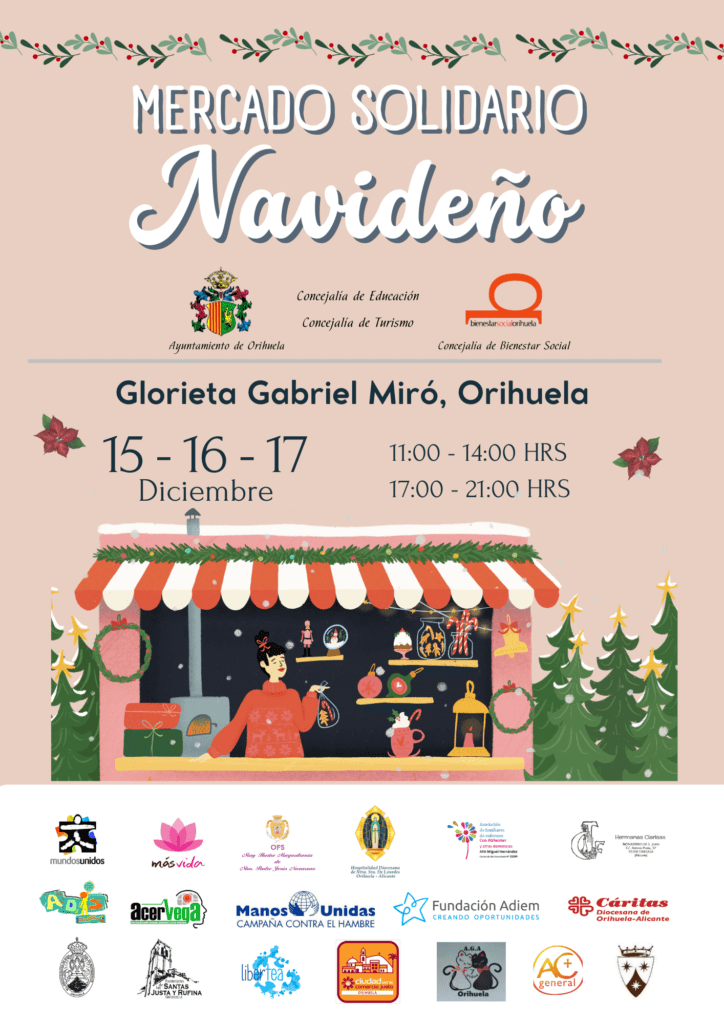 Este año el mercadillo contará con la participación de 18 asociaciones y colectivos como: Parroquia de Santas Justa y Rufina, Cáritas Interparroquial, Misiones Carmelitas, Fundación ADIEM, Hospitalidad de Nuestra Señora de Lourdes, Libertea, Mayordomía de Nuestro Padre Jesús Nazareno, Manos Unidas, Cofradía de Nuestra Señora de Monserrate, Comercio Justo, Hermanas Clarisas, ACERVEGA, ADIS, Más Vida, Asociación de Familiares de Enfermos de Alzheimer “Miguel Hernández, Acción Católica, Mundos Unidos, 7 vidas. Estas asociaciones y colectivos trabajan en la atención a personas en situación de vulnerabilidad, ámbito de la discapacidad, de la salud, la cooperación internacional, entre otros ámbitos.