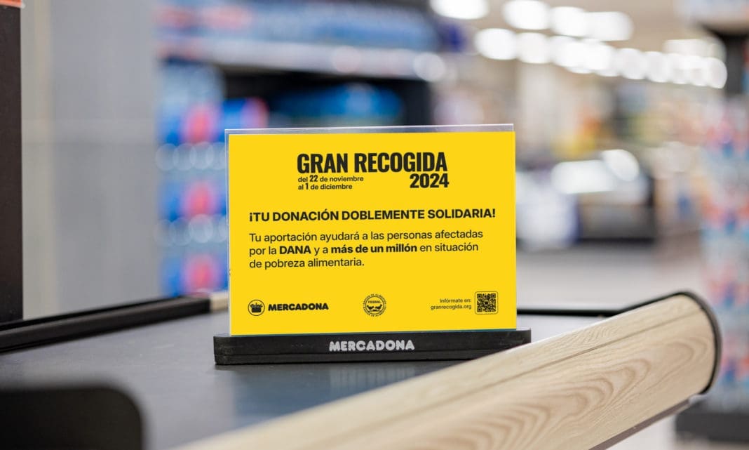 Mercadona, compañía de supermercados físicos y de venta online, se suma a la Gran Recogida de Alimentos organizada por la Federación Española de Bancos de Alimentos (FESBAL), que comienza hoy y se alargará hasta el 1 de diciembre. La compañía pone a disposición de la campaña sus puntos de venta para la recaudación de fondos, con el objetivo de dar a sus clientes la posibilidad de participar en este gran evento solidario anual a favor de los Bancos de Alimentos.
