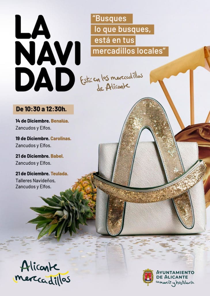 Por su parte esta Navidad los mercadillos municipales José Manuel Gosálbez, Carolinas, Benalúa y Babel de venta al aire libre, mantienen la apertura de sus puestos todos los jueves y sábado, de 8 a 14 horas. En los mercadillos también se han organizado jornadas de dinamización comercial con Zancudos y Elfos, en horario de mañana, de 10,30 a 12,30 horas el 19 en Carolinas, el 21 en Babel y el 21 de diciembre en Teulada con talleres de Navidad.