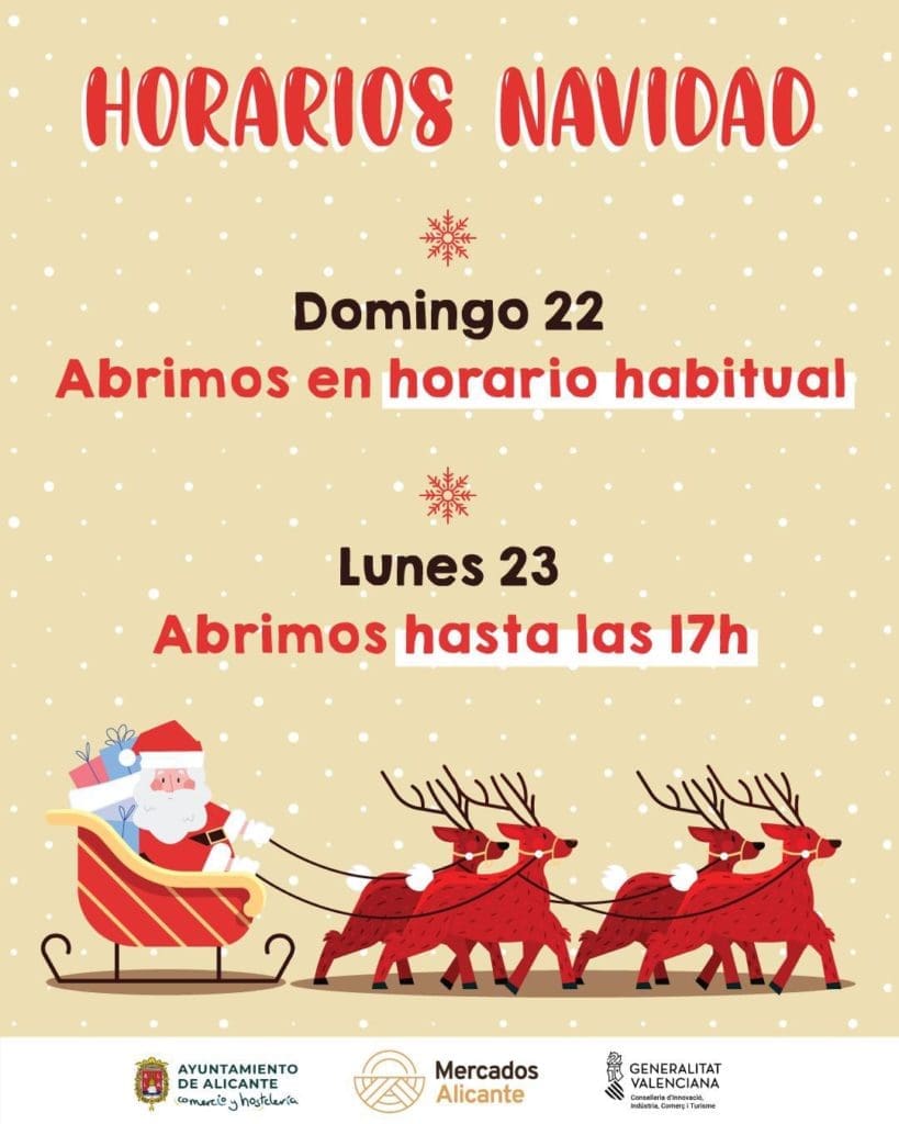 El Ayuntamiento de Alicante ha autorizado la apertura extraordinaria de los mercados municipales Central, Babel, Benalúa y Carolinas del próximo domingo 22 de diciembre, festivo autorizado en la Comunidad Valenciana para los establecimientos comerciales por la campaña de Navidad. Así como se amplía el horario de apertura del lunes 23 de diciembre, hasta las 17.00 horas, y se mantendrá abierto en Nochebuena en su horario habitual.
