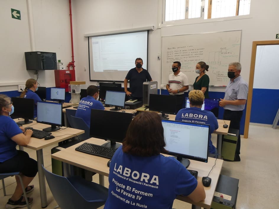 Serafín López, concejal de Empleo y Bernabé Cano, alcalde de La Nucía, visitaron el aula formativa del programa Et Formem la Favara IV 2ª “Etapa de Montaje y Reparación de Sistemas Microinformáticos” en la Escuela de Oficios, acompañados por Patricia Alcázar, directora del programa Et Formem y Antonio Piñera, director de la Agencia Desarrollo Local