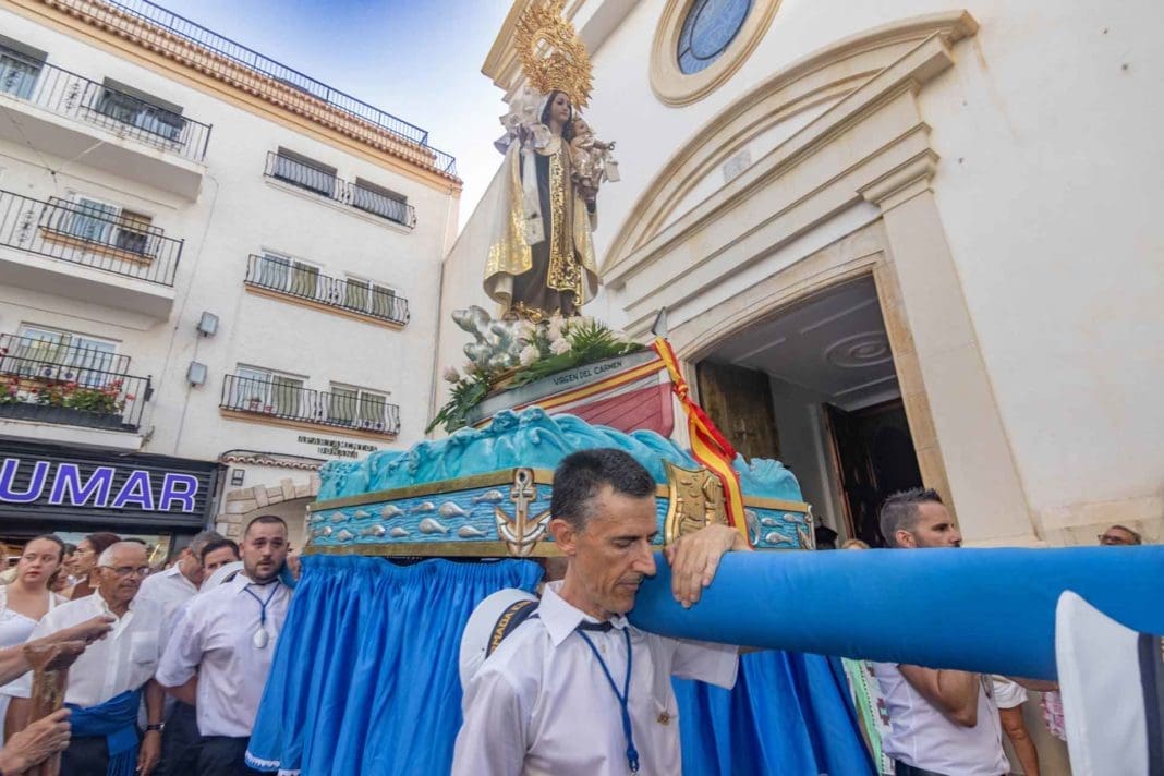 La imagen, en la proa de una golondrina, inició su recorrido por Levante y Poniente pasadas las 20.00 h, escoltada por otra golondrina y muchas embarcaciones particulares, incluso a remo, como las del Club Náutico y la de la asociación Anémona, y con la protección de las lanchas de la Policía Local y del servicio de socorrismo de playas.