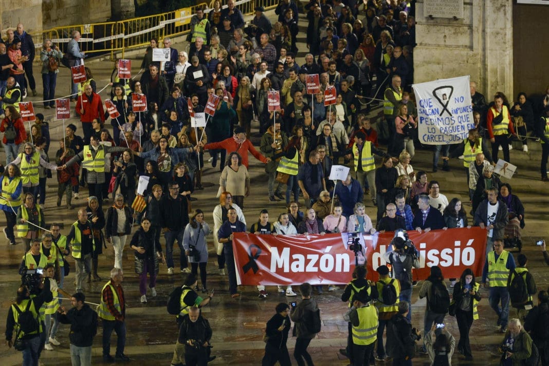 Este sábado, la ciudad de Valencia fue escenario de una protesta multitudinaria que reunió a cerca de 100.000 personas, según la Delegación del Gobierno, para exigir la dimisión de Carlos Mazón y su equipo por la gestión de la DANA del 29 de octubre. La manifestación, convocada por más de 50 entidades sociales y sindicales, comenzó en la plaza del Ayuntamiento y concluyó en la plaza de la Virgen.