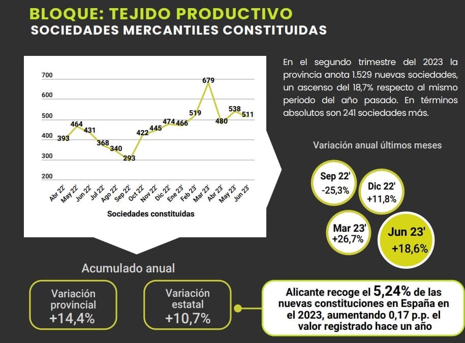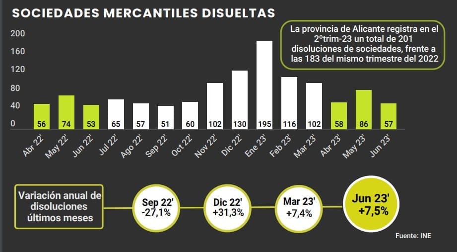 Otro indicador que mueve a preocupación es el de las altas disoluciones de empresas, que precisamente tienen más incidencia en las comarcas tradicionalmente más vinculadas al calzado, como Vinalopo Mitjà y Baix Vinalopó, donde también se producen mayor número de constituciones de negocios, indica Francisco Llopis. Esta es en general una situación característica de la provincia sobre la que alertan los analistas. En el segundo trimestre se disolvieron la mitad de negocios que los que se crearon. Las cifras de constitución de sociedades, un 18,7% supera con creces a la la media nacional, situada en un 10,2% pero quienes echaron el cierre en la provincia (9,85%) casi triplican las cifras del país (3,8%).