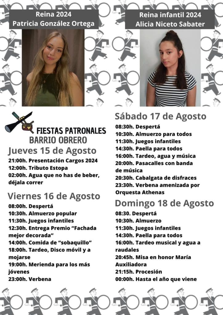 En su programa incluyen juegos tradicionales y un conjunto de actividades para todos los públicos. Entre ellas destacan las despertàs, el concurso de fachadas mejor decoradas, la cabalgata de disfraces, tardeos, arroz gigante «para todos», y una verbena con la orquesta ‘Athenas’ (sábado 17, a partir de las 23.30 horas). La faceta religiosa la ponen el 18 de agosto la misa (20.45 horas) y la procesión (21.15 horas) para celebrar a la Patrona. Las Reinas de las Fiestas que serán proclamadas en la noche del 15 de agosto son Patricia González Ortega (adulta) y Alicia Niceto Sabater infantil)