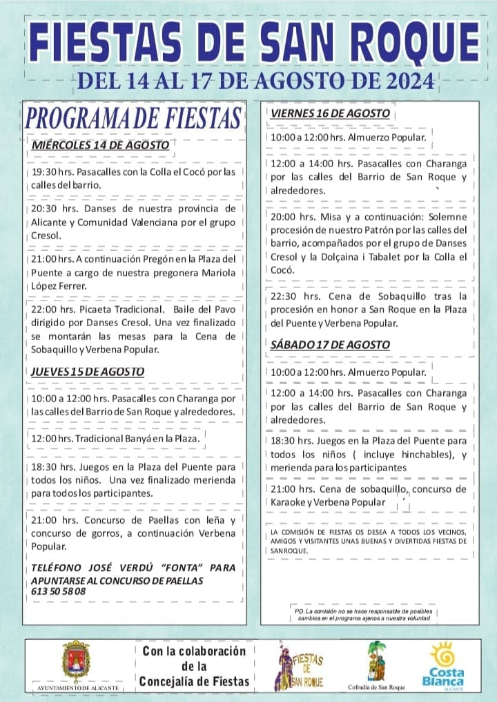 Los actos comenzarán el miércoles 14 de agosto con el pregón que Mariola López, de Alacantí TV, pronunciará en la Plaza del Puente. Le seguirá el tradicional ‘Baile del Pavo’, dirigido por los integrantes del grupo de danzas ‘Crisol’. Pasacalles con charanga, distintos concursos -paellas a la leña y de gorros-, cenas de sobaquillo, juegos para niños y meriendas completan un programa en el que tono más jocoso lo pone la banyà programada para el jueves 15 de agosto (12 horas). Alicante, en diferentes etapas, viene celebrando a San Roque desde el siglo XVI.