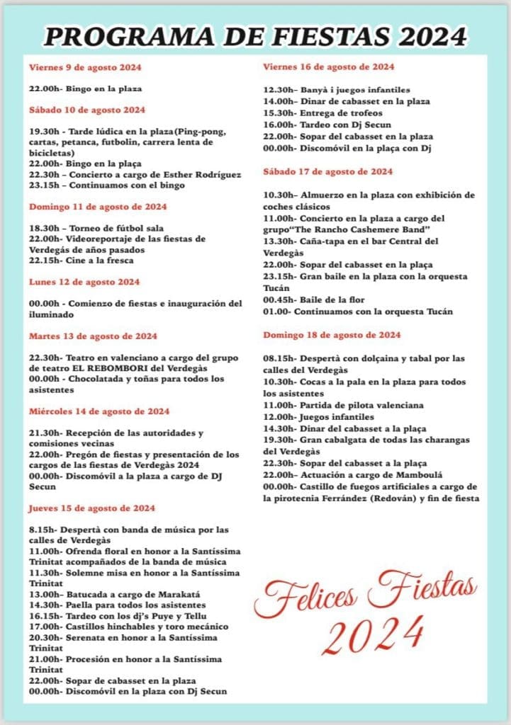 Desde el jueves 15 de agosto al domingo 18 se suceden los actos. El primero de estos días está dedicado, preferentemente, a honrar a la patrona con la ofrenda (11 horas), misa (11.30), serenata (20.30) y procesión (21 horas). A partir de ahí se irán sucediendo actividades como como batucadas, paellas, tardeos, banyàs, discomóvil, exhibición de coches clásicos, conciertos, caña-tapa, baile con orquesta, despertàs, y cabalgata en la que participan todas las charangas de Verdegás (domingo 18, a las 19,30 horas). El disparo de un castillo de fuegos artificiales, a cargo de la Pirotecnia Ferrández, cierra estos actos.
