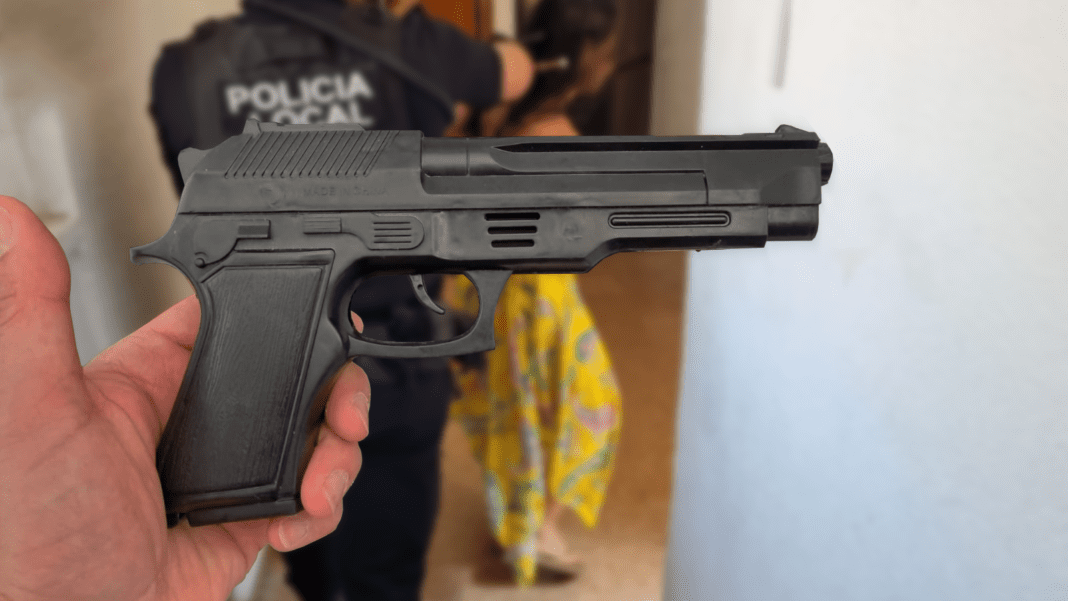 Finalmente encontraron a la implicada en la tercera planta en compañía de su madre y una tercera persona, no portando ningún objeto en las manos y en actitud tranquila. Fue el acompañante el que entregó a los agentes la supuesta arma, que se encontraba en el interior de su vivienda, pudiendo comprobar que era una imitación de plástico, aunque suficientemente realista como para generar confusión.