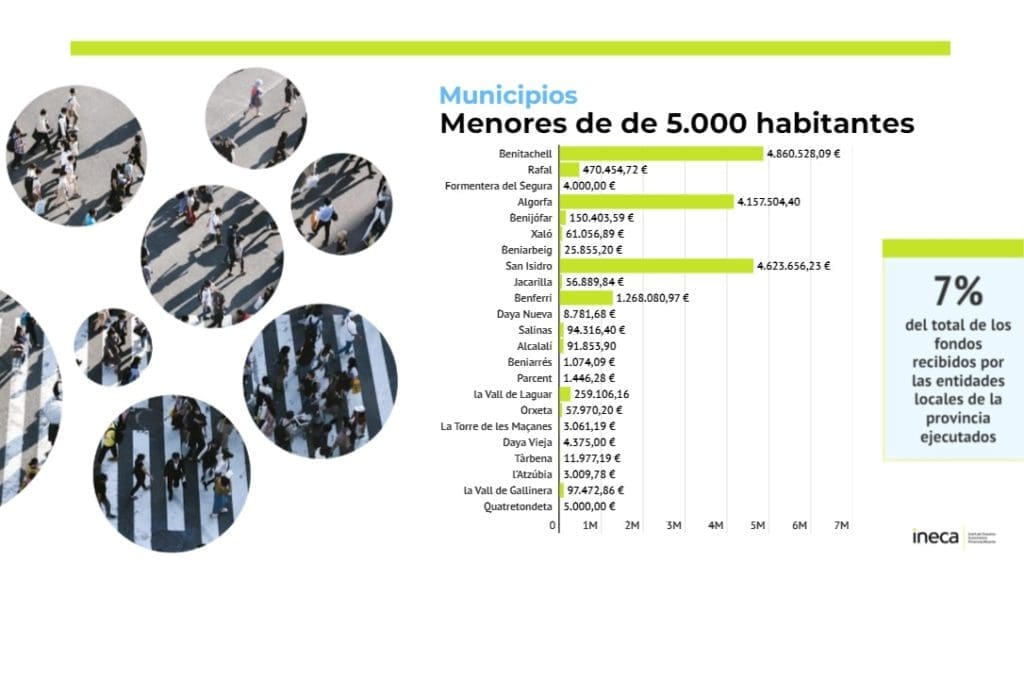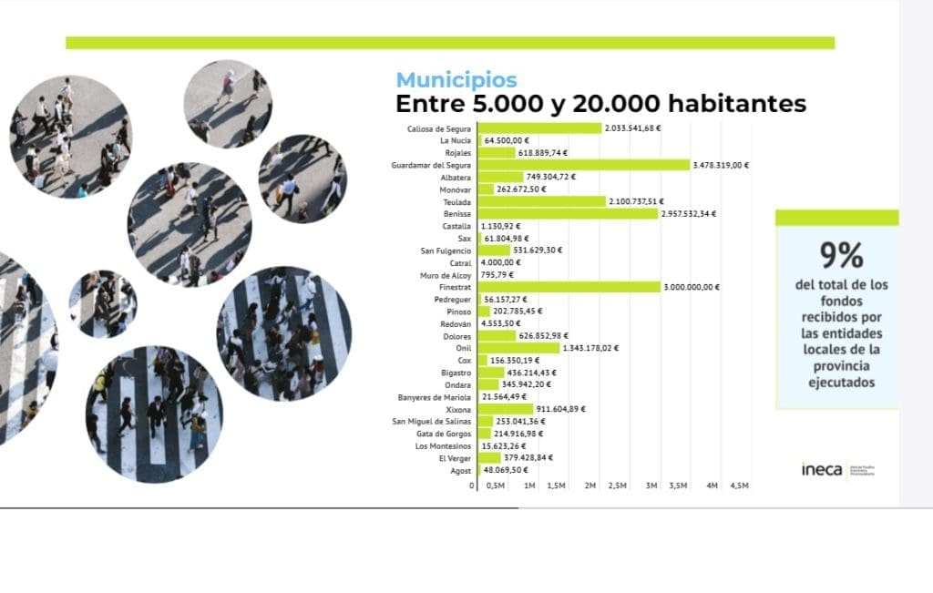 Volviendo a las ayudas Next Generation ya conseguidas por los municipios alicantinos, entre junio de 2021 y el pasado diciembre, destacan las ayudas conseguidas por Alicante (33,1 millones de euros), Elche (26,1), Alcoy (22,8) o Torrevieja y Benidorm, que superaron los 20 millones de euros. Esto en lo tocante a municipios de más de 50.000 habitantes.
