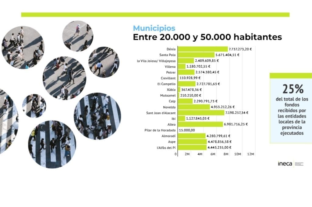 Las poblaciones de 20.000 a 50.000 habitantes lograban captar una de cada cuatro ayudas y un montante global de 58,8 millones de euros. Destacan los volúmenes conseguidos por Dénia (7,7 millones de euros), Sant Joan d’Alacant (7,1 millones) o Altea (6,9 millones). Desde Ineca han valorado el esfuerzo de poblaciones como Guardamar del Segura, Finestrat, Benissa, Teulada o Callosa de Segura, donde residen entre 5.000 a 20.000 habitantes. Todos los municipios de esta horquilla demográfica han recibido un montante final de 20,8 millones de euros.