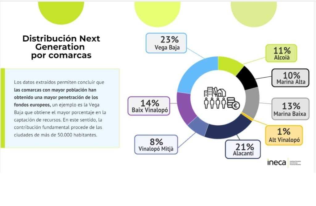 Son unos datos que ha dado a conocer este miércoles el Instituto de Estudios Económicos de la Provincia de Alicante (INECA) gracias a un estudio encargado a Crea 360. Tras efectuar un estudio del impacto de estas ayudas europeas puestas en marcha para afrontar la crisis de la covid-19, en España en el marco del Plan de Recuperación, Transformación y Resiliencia, los analistas llaman a la reflexión sobre la desigual manera en que se han podido beneficiar la población dependiendo del lugar donde residen.