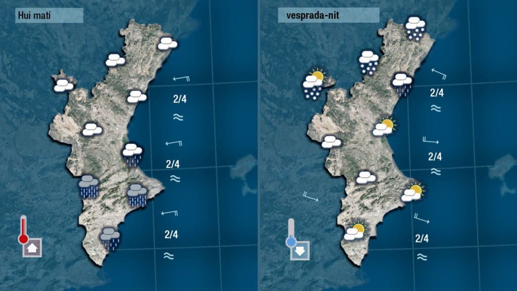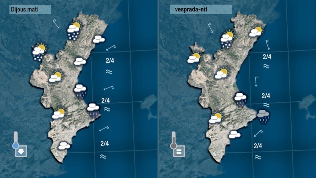 No hay que perder la esperanza porque jueves hasta mediodía o primera hora de la tarde el gregal aportará nubes a la costa de la mitad sur de la Comunitat y todavía podría llover pero la tarde-noche de jueves podemos ir haciéndonos a la idea que la lluvia nos dirá adiós, porque a pesar de que por la tarde podría escaparse alguna gota y algún copo de nieve serán anecdóticos.