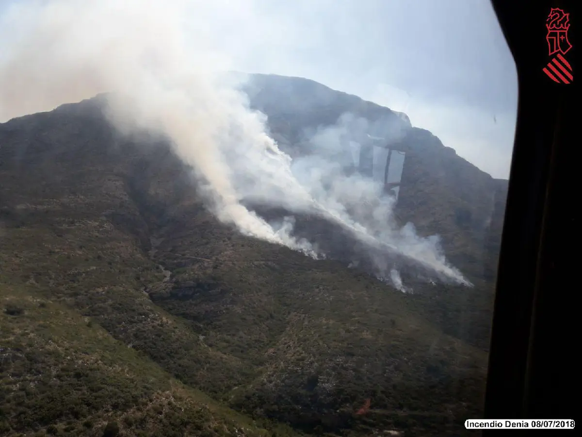 Nueve medios aéreos de la Generalitat y del Consorcio de Bomberos de Alicante trabajan en las tareas de extinción de un incendio declarado a las 15.50 horas de esta tarde en el Montgó, en Jávea (Alicante).