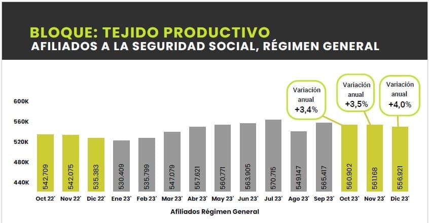 Otro de los aspectos que los analistas han destacado como positivos es la evolución de la afiliación a la Seguridad Social y el descenso del paro. Mantiene un crecimiento similar al nacional aunque aumenta la proporción de autónomos respecto a las altas en régimen general, lo que configura un mapa de microempresas que no permiten desarrollar todo el potencial del tejido económico, ya que dede INECA defienden precisamente un mayor tamaño de las empresas para incrementar su competitividad y capacidad de innovación.