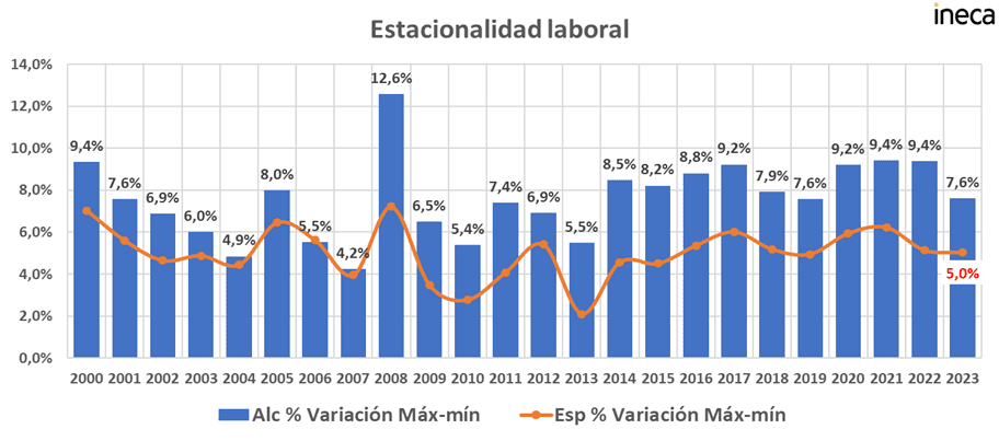 En términos objetivos, y dependiendo de la fase del ciclo económico, esta estacionalidad conlleva que hasta unas 16.000 personas entre/salgan del mercado laboral. En el último año la cifra fue de 11.500 trabajadores.
