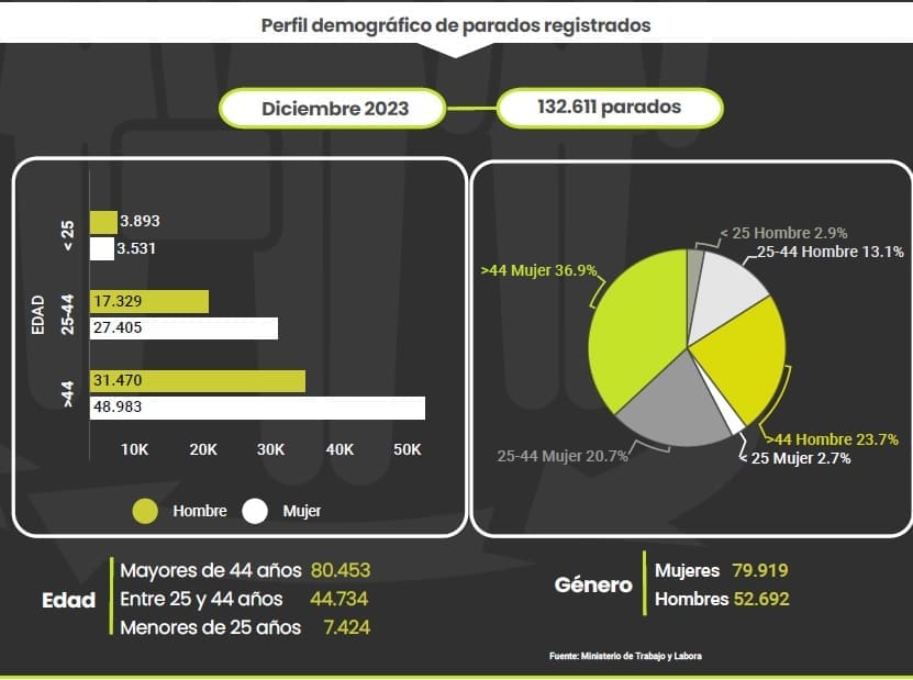En la cara contraria, las personas sin empleo también han registrado descensos. Alicante es la quinta provincia con más paro, especialmente mujeres -79.919 frente a 52.692 hombres- mayores de 44 años -80.453 frente a 44.737 personas entre 25 y 44 años-.