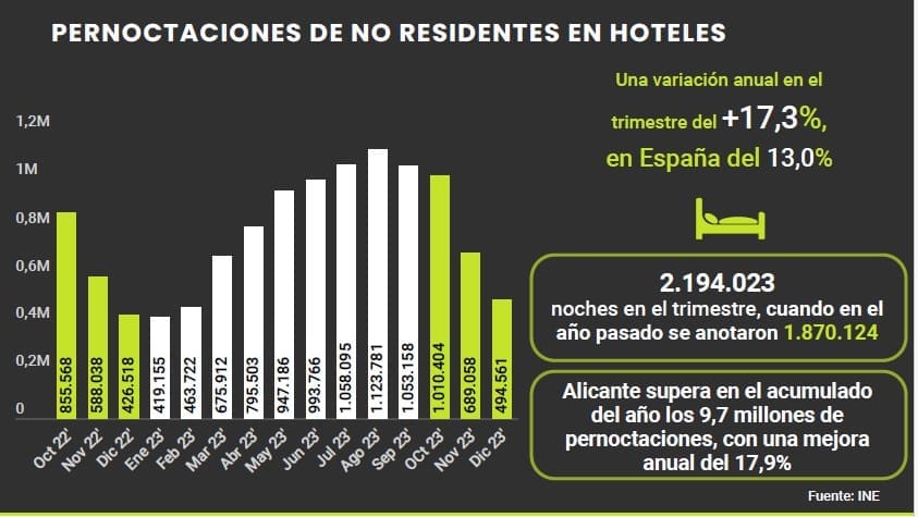 Las pernoctaciones extranjeras en hoteles constituyen otra segunda palanca capital para los ingresos económicos del territorio alicantino. A diferencia de las estancias de visitantes españoles que acumulan 8 meses con variaciones anuales negativas, la tendencia de quienes cruzan fronteras rumbo a nuestra provincia es creciente. El último trimestre de 2023 fue un 17,3% superior al mismo periodo de 2022, cifra distante del 13% de la media de España. En total, 9,7 millones de extranjeros disfrutaron de unos días en a provincia en 2023.