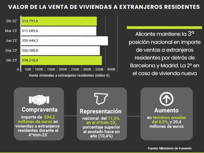 En el indicador del importe de las ventas a extranjeros residentes, cabe señalar que la cuantía de la compraventa de este mercado se mantiene en general con unos crecimientos muy ligeros. Se ha pasado de crecer un 30% en el 2022 a un 2,7% en 2023, pero se venía de un año 2020 con una economía prácticamente estancada por las restricciones derivadas de la pandemia, por lo que seguimos con cifras muy destacadas.