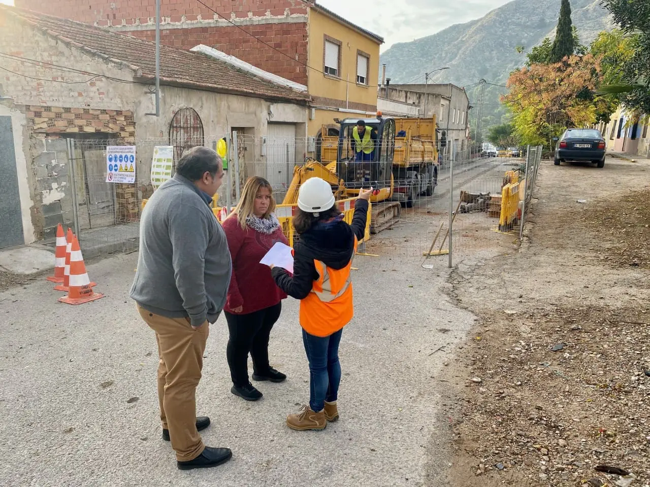 El concejal de Infraestructuras, Ángel Noguera, y la alcaldesa pedánea de San Antón, Vanesa Sánchez, han visitado las obras de reposición de la red de agua potable y saneamiento en el camino de la Cruz de la Muela, en el mencionado barrio.