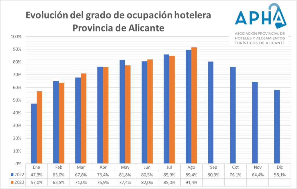 Agosto ha cerrado con una tasa de ocupación turística del 91,4% en la provincia de Alicante, el mejor dato del año, superando en 6,4 puntos porcentuales el dato de julio y también 2 puntos por encima del dato de 2022.