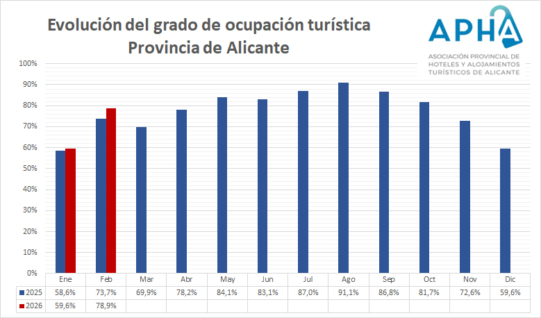 La ocupación turística en la provincia de Alicante ha alcanzado el 78,9 % en febrero, lo que supone 5,2 puntos porcentuales más que en el mismo mes de 2025 y el mejor registro de la serie histórica para este periodo. El dato también mejora claramente el del mes anterior, con un incremento de 19,3 puntos, según los balances del sector hotelero provincial.