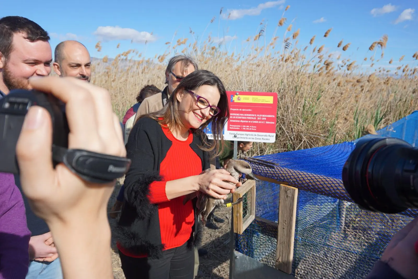 La vicepresidenta del Consell y consellera de Igualdad y Políticas Inclusivas, Mónica Oltra, ha participado en la suelta de doce ejemplares de cerceta pardilla en el Parque Natural El Hondo de Elche.