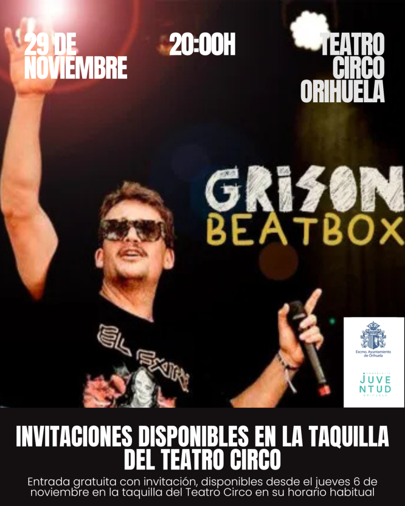 La Concejalía de Juventud de Orihuela ha informado que, con motivo de la actuación de Grison Beatbox prevista para el viernes 29 de noviembre dentro del ciclo Noches de Humor, será necesario adquirir una entrada gratuita en la taquilla del Teatro Circo Atanasio Die para poder acceder al espectáculo.