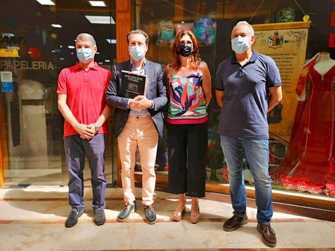 Los concejales de Comercio y Turismo, Víctor Bernabéu y Mariola Rocamora respectivamente, junto al presidente de la Asociación de Comerciantes del Municipio de Orihuela (ACMO), Ascensio Pérez y el presidente de la Asociación de Fiestas de Moros y Cristianos, José Vegara, han presentado esta mañana la campaña de adorno de escaparates, en la que están implicados los comerciantes oriolanos, para realzar las fiestas de Moros y Cristianos que por segundo año no se podrán celebrar debido a la crisis sanitaria.