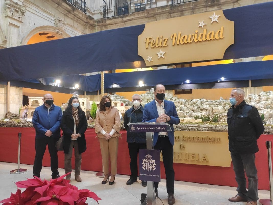 El alcalde de Orihuela, Emilio Bascuñana, ha inaugurado este jueves el Belén Municipal, junto a la concejal de Festividades, Mariola Rocamora, y el edil de Sanidad, José Galiano. Al acto han asistido también la familia belenista Hernández Cabrera, y José Antonio Martínez, director del Museo de Arte Sacro.